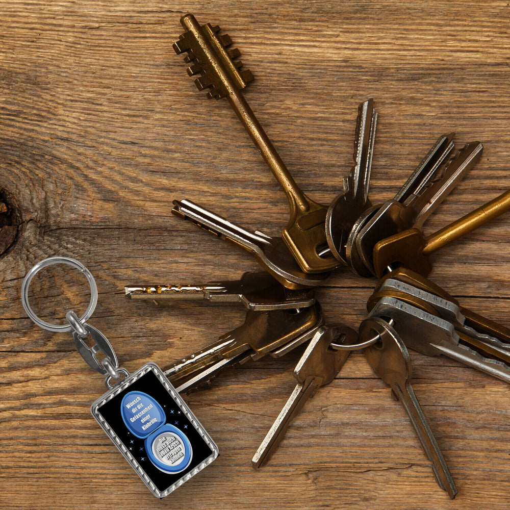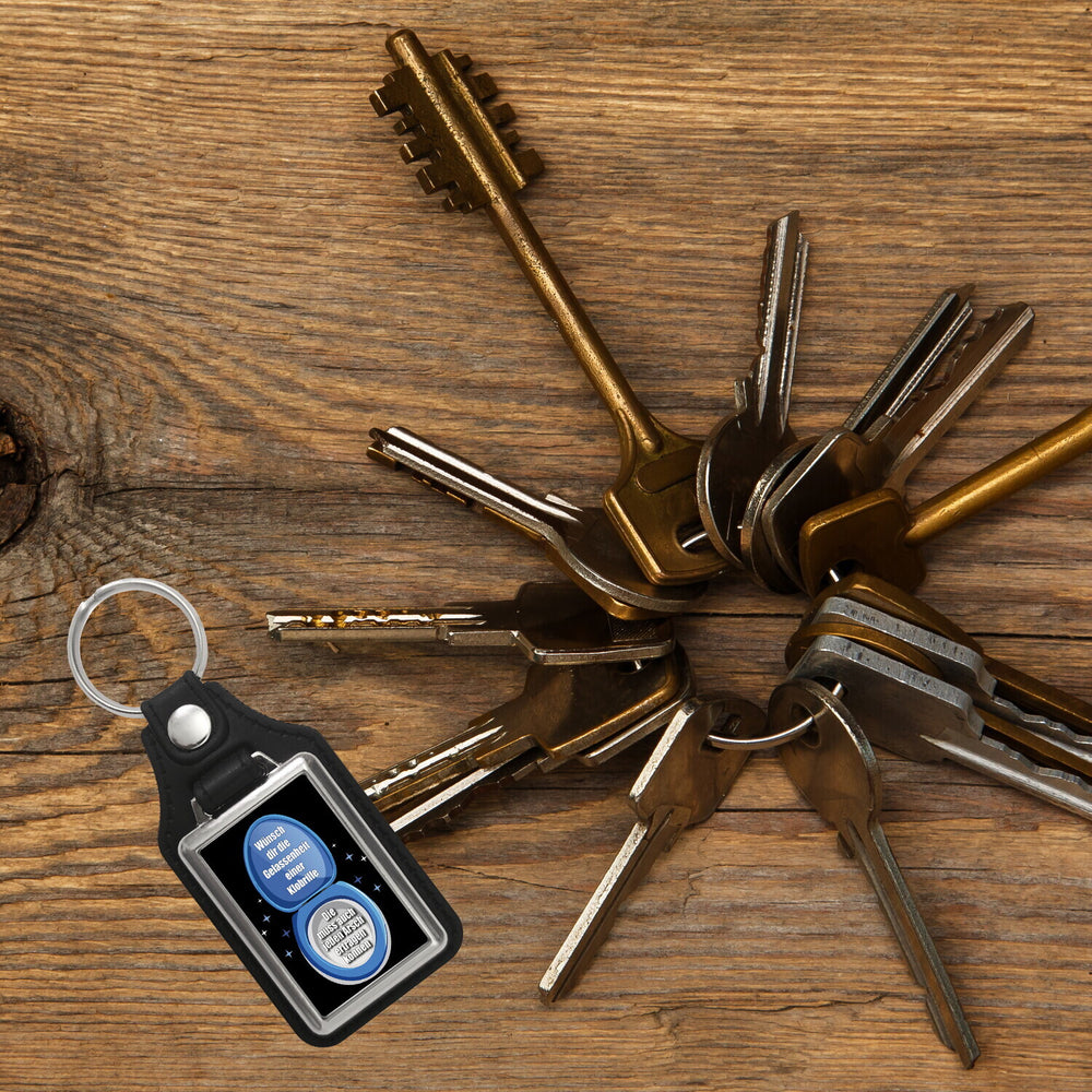 - Erhältlich in unterschiedlichen Ausführungen: Als Standardvariante, mit edler Bordüre oder als exklusive Kunstleder-Version. Jeweils inklusive passendem Schlüsselring aus Metall. Mit Sorgfalt bedruckt in unserer Schlüsselanhänger-Manufaktur in Deutschland.