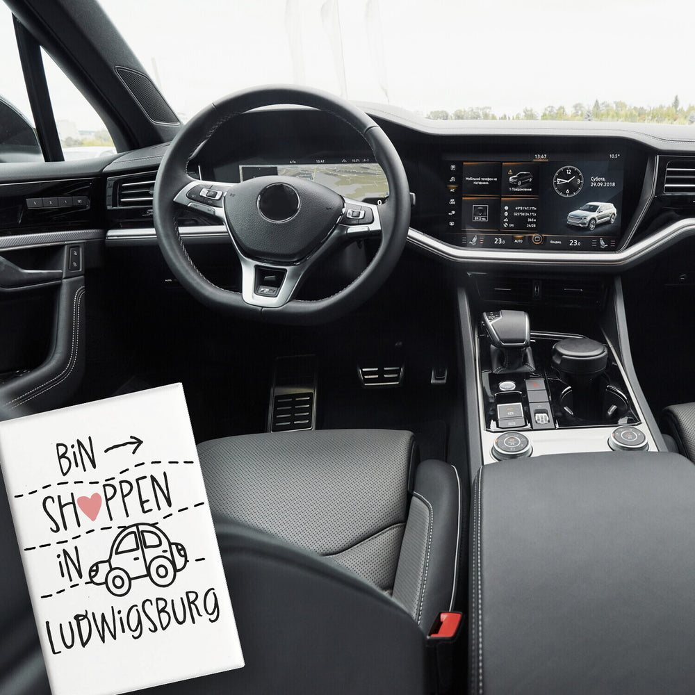 Der eckige Magnet zeigt ein handgezeichnetes Cartoon-Auto auf weißem Hintergrund mit dem lustigen Spruch 'BIN -> SHOPPEN in LUDWIGSBURG'. Das Design ist einfach und verspielt, mit abgerundeten Formen und einem markanten Pfeil. Perfekt für alle, die Hum Hinweise: Größe: ca. 8x5,5 cm