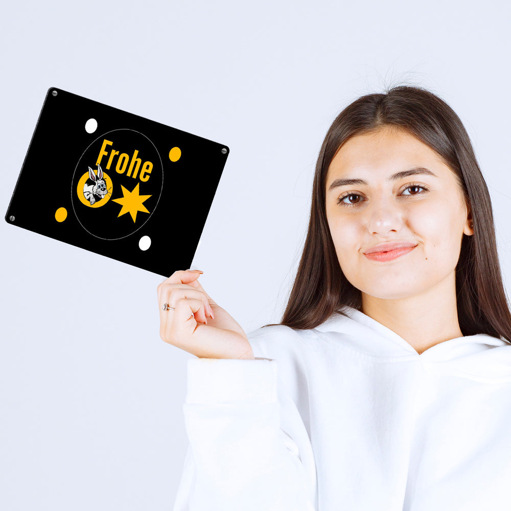 - 1x Osterhase Metallschild in 15x20 cm mit Spruch: Frohe Ostern in der gewählten Größe