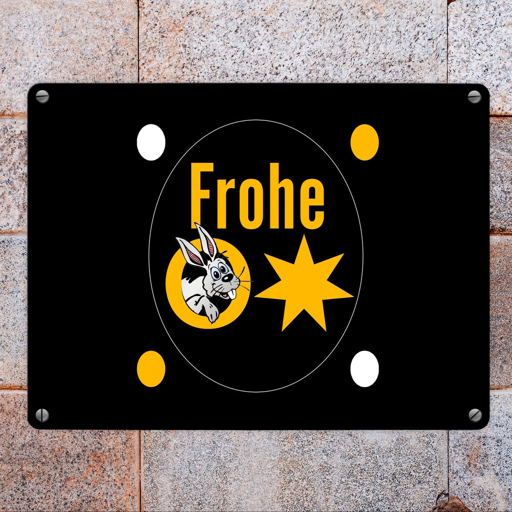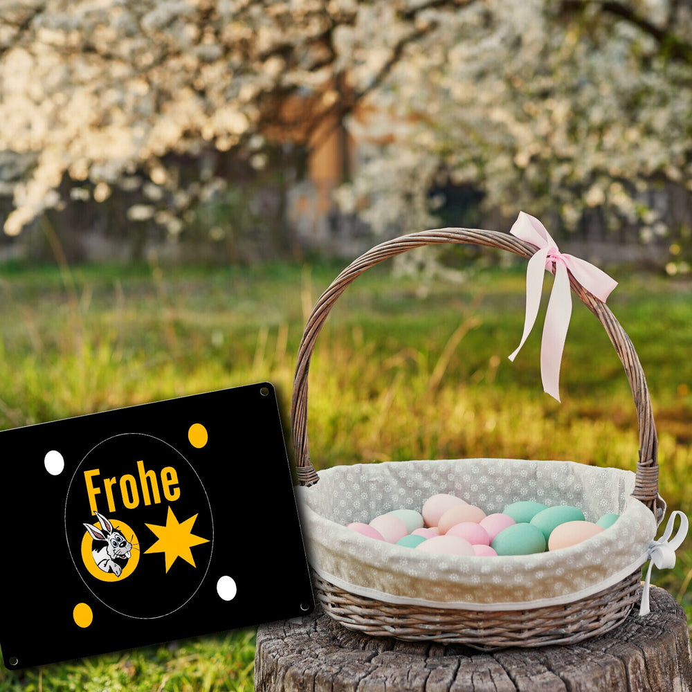 Osterhase Metallschild in 15x20 cm mit Spruch: Frohe Ostern - 15x20 cm ist auf Lager und wird versandt, sobald es wieder verfügbar ist
