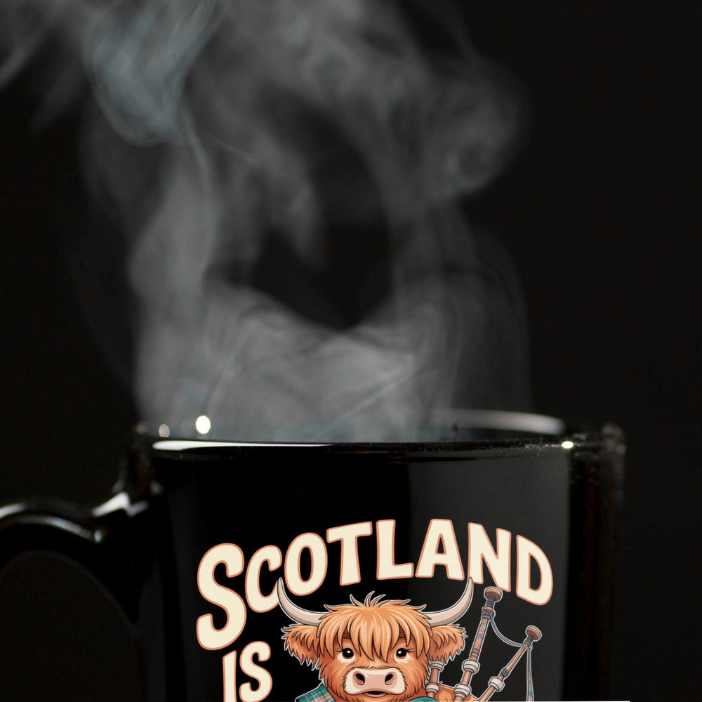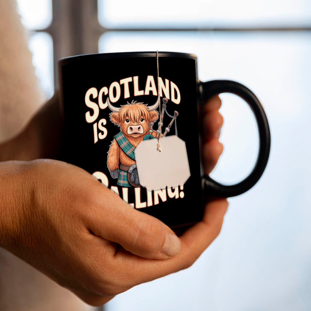 - Die Tasse zeigt ein flauschiges Highland-Rind im charmanten Cartoon-Stil, das stolz einen traditionellen Kilt und Dudelsäcke präsentiert. Mit seinem zotteligen, rotbraunen Fell und den charakteristischen Hörnern zieht das Rind alle Blicke auf sich. Der dramatisch schwarze Hintergrund hebt den humorvollen Spruch "Scotland is calling!" hervor.