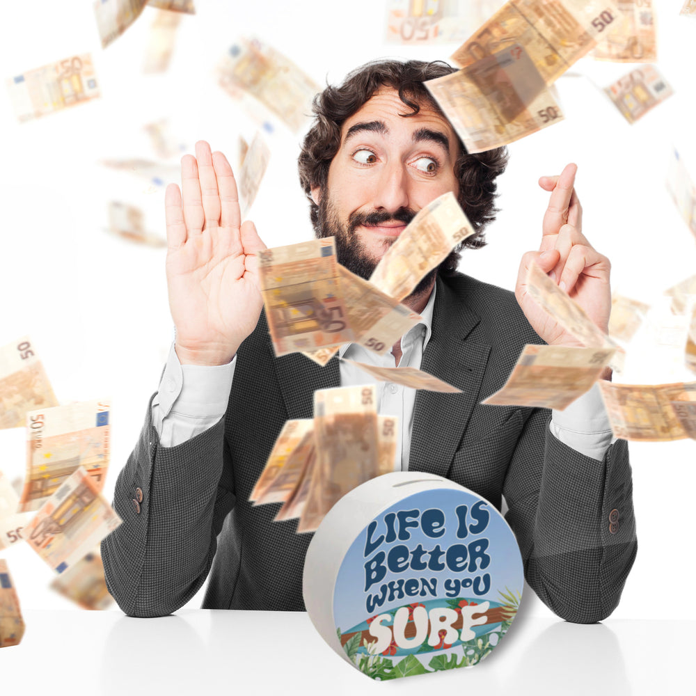 - 1x Spardose mit schönem Surfbrett Motiv und Spruch - Life is better when you surf in der gewählten Ausführung