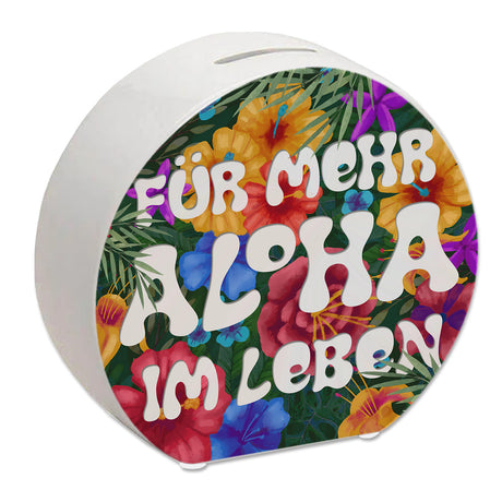 Spardose mit buntem Blumenmotiv und Spruch - Für mehr Aloha im Leben