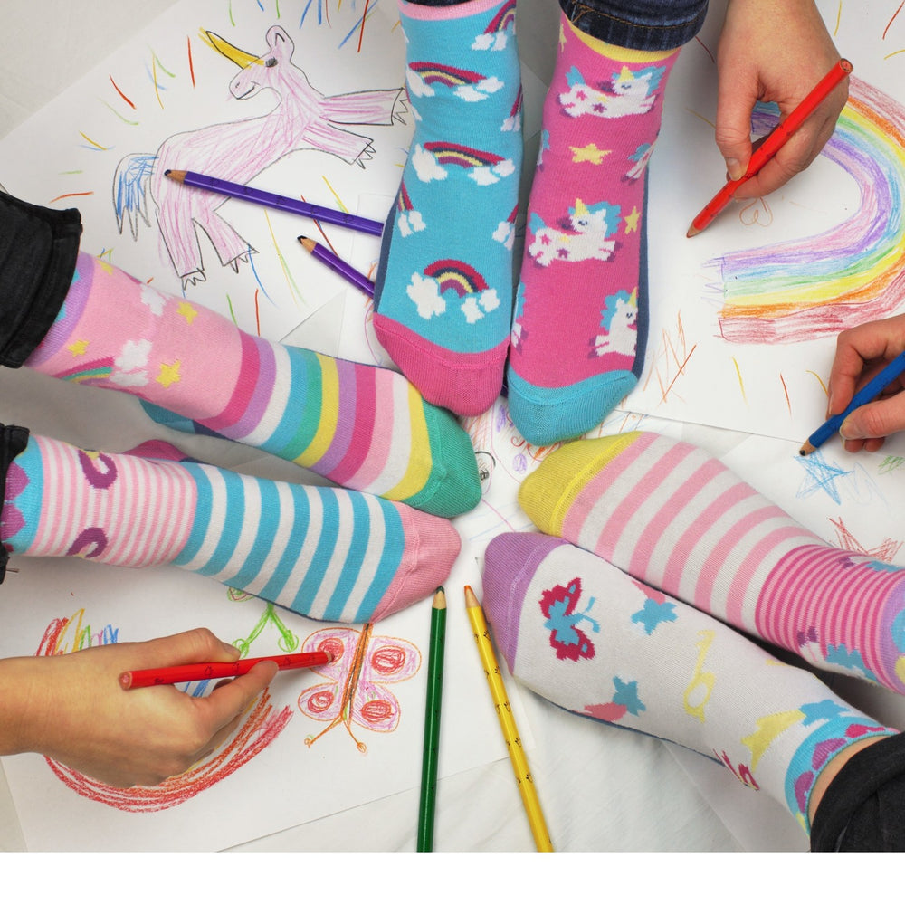 1x 6er Set Einhorn und Regenbogen Oddsocks Socken.