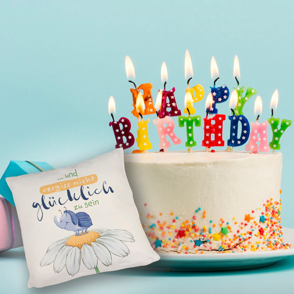 - 1x Käfer Kissen mit Spruch und vergiss nicht glücklich zu sein in der gewählten Ausführung