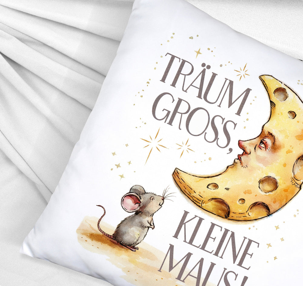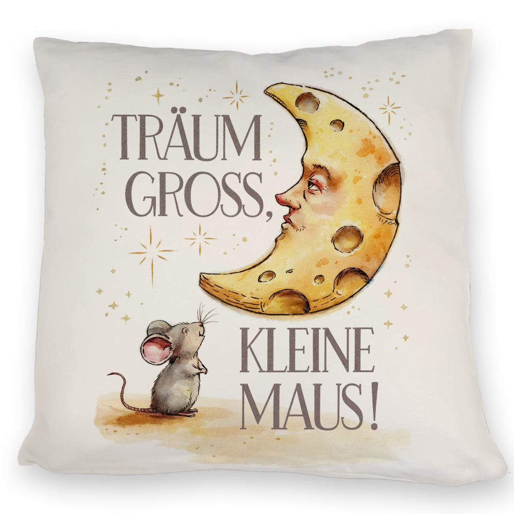 • Das "Maus und Mond Träum groß" Kissen bezaubert mit einem charmanten Motiv: Eine kleine Maus bewundert ehrfürchtig einen riesigen Mond aus Käse, umgeben von funkelnden Sternen. In pastellfarbenem Aquarellstil erstrahlt der Spruch "Träum gross, kleine Maus!" auf einem weißen Hintergrund.