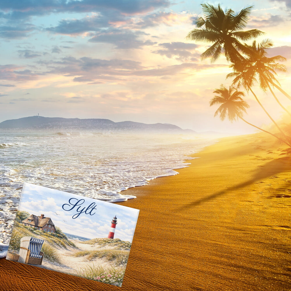 - Der eckige Magnet besticht durch sein idyllisches Küstenszenario, das einen charmanten Strandkorb, ein malerisches Reetdachhaus und einen ikonischen rot-weißen Leuchtturm zeigt. Die beruhigenden Blautöne des Himmels und das Meer im Hintergrund verleihen dem Magneten eine friedliche, maritime Atmosphäre.
