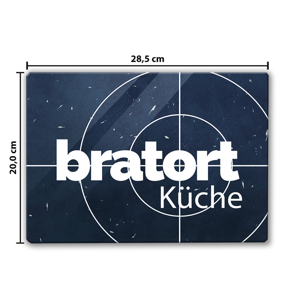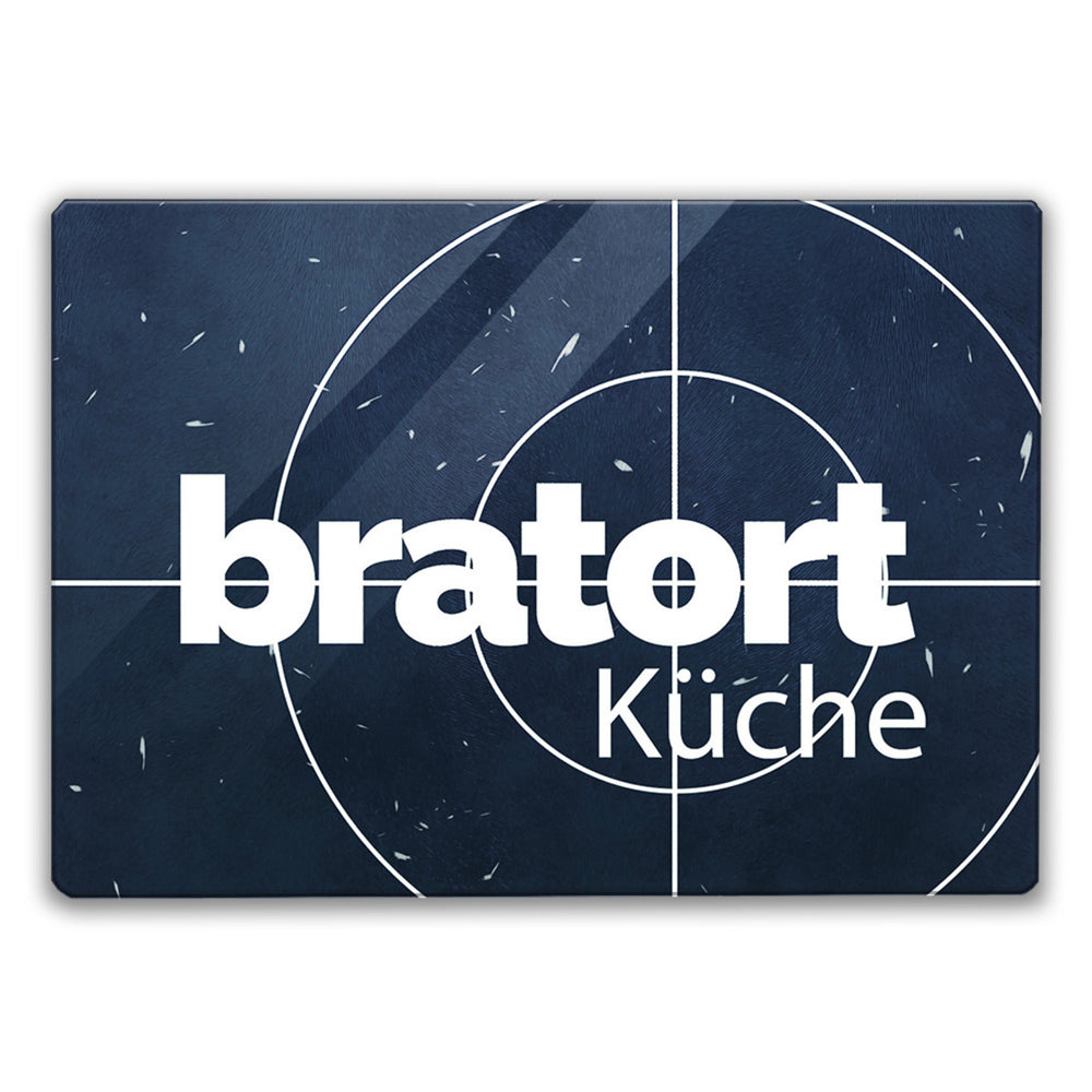 Fernsehkrimi Schneidebrett aus Glas mit Spruch Bratort Küche