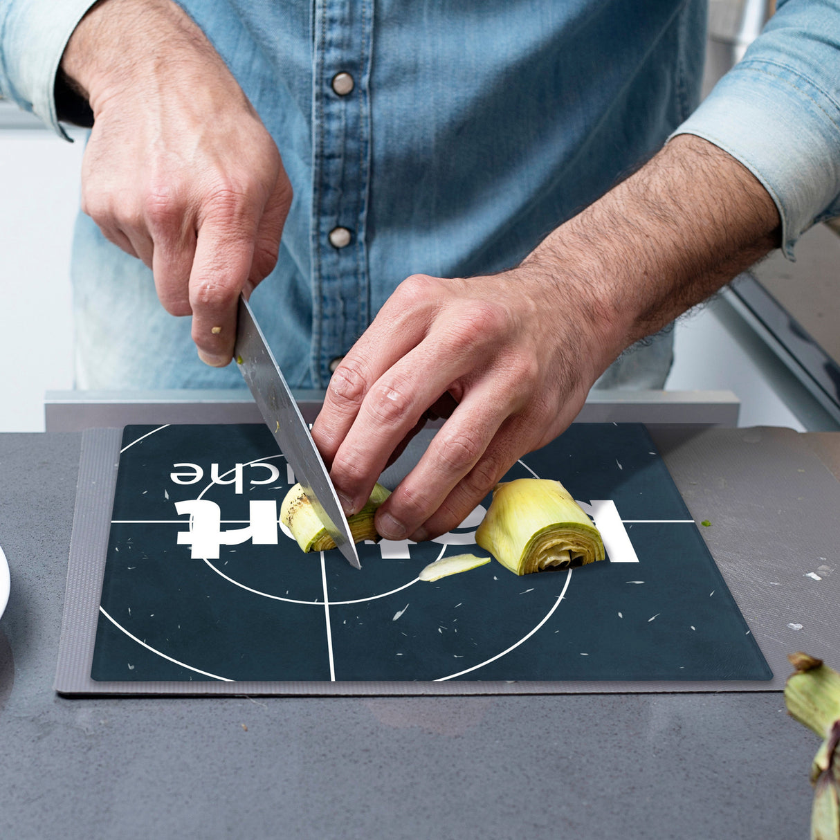 - Unser Schneidebrett besticht durch ein einzigartiges Design, das jeden Krimifan zum Schmunzeln bringt. Das dunkelblaue Glasbrett zeigt einen humorvollen Schriftzug, in dem das O geschickt zu einem Fadenkreuz umfunktioniert wird. Ein Muss für jede Küche, denn hier wird nicht nur gekocht, sondern auch detektivisch ermittelt!