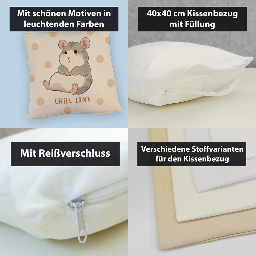 - Das Produkt ist ein lustiges Kissen mit einem pummeligen Hamster-Motiv. Der süße Hamster sitzt entspannt in seiner "Chill Zone". Der Kissenbezug ist kuschelig weich und kommt mit einem passenden Kissen Inlay. Das Design ist in vier verschiedenen Oberflächen erhältlich, von kuschelig bis satiniert. Ein perfektes Dekokissen für das Sofa oder Kinderbett.