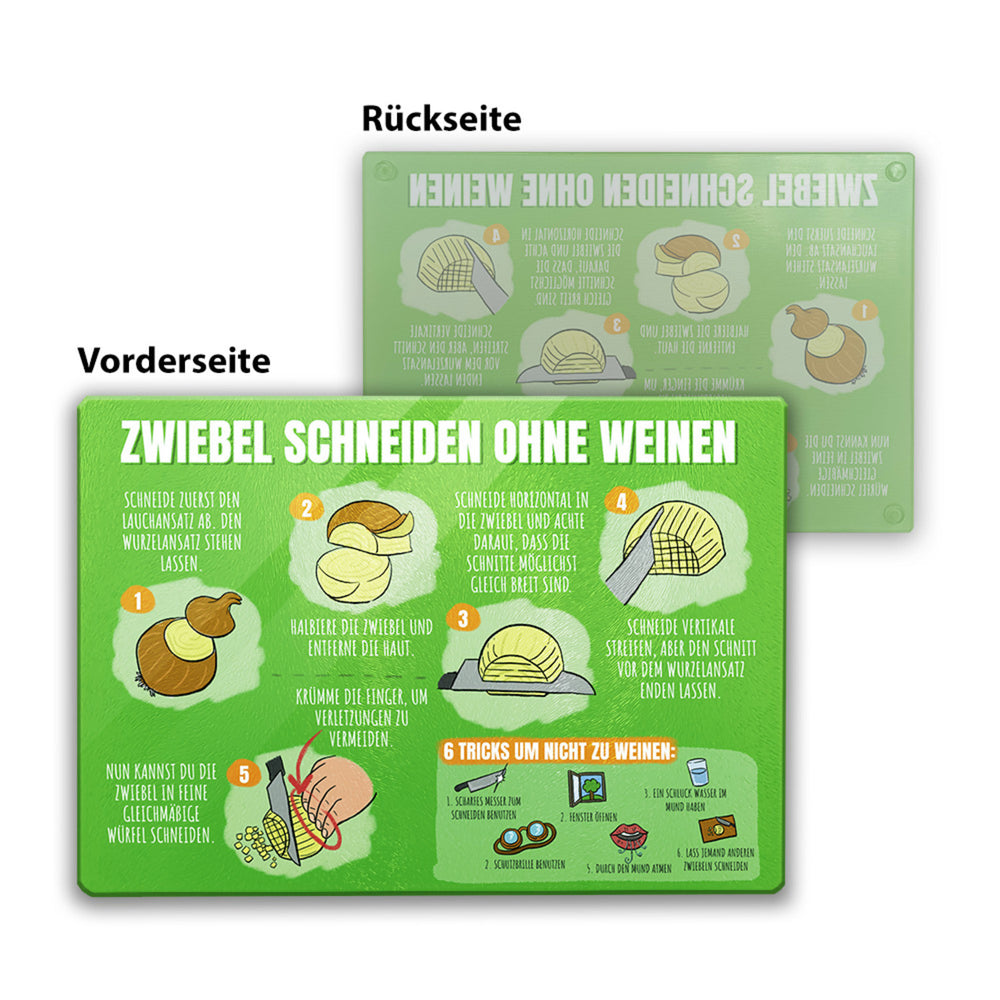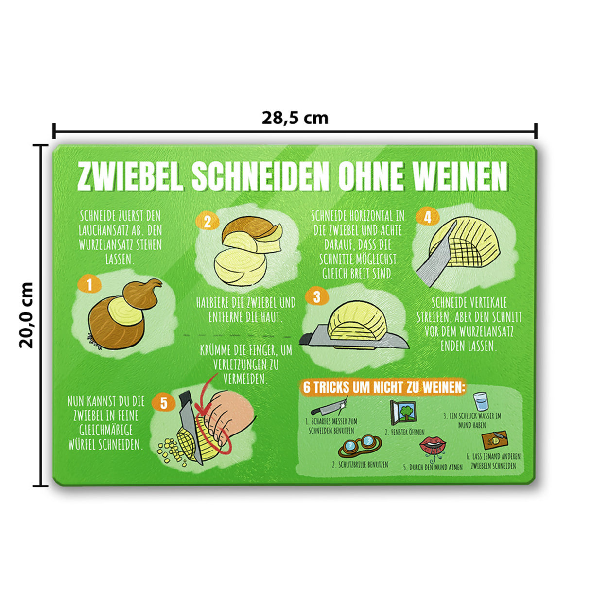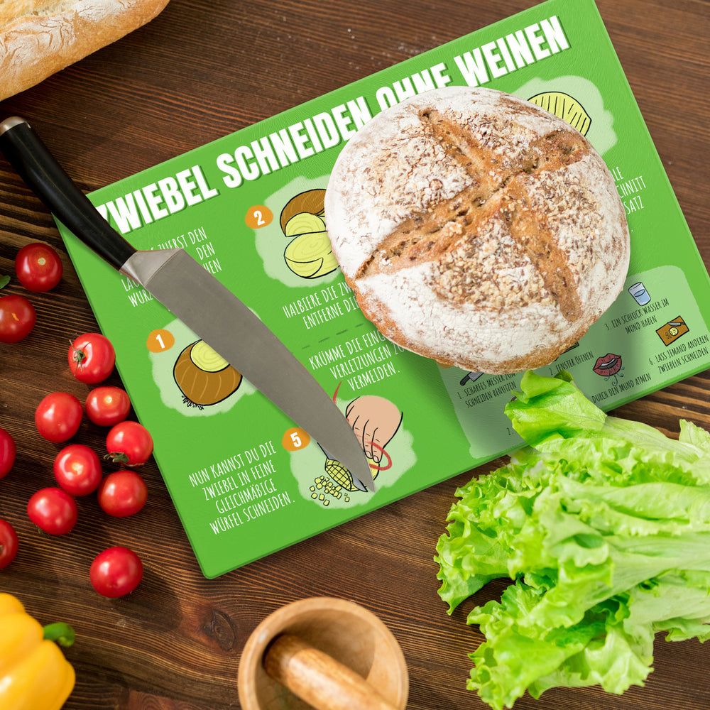 - Das Schneidebrett mit Zwiebelmotiv ist ein wahrer Hingucker in jeder Küche. Sein Design vereint Praktikabilität mit Charme, indem es eine Schritt-für-Schritt-Anleitung zum Zwiebelschneiden zeigt. Für jeden, der gerne kocht und dabei nicht weinen möchte, ist dieses Glas-Schneidebrett ein Muss.