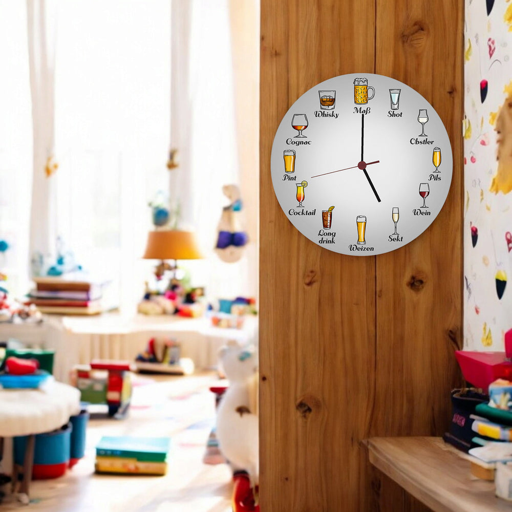 Bist du bereit, die Zeit mal anders zu erleben? Unsere Alkoholische Getränke Wanduhr mit Bier, Wein und Co. ist das ultimative Highlight für dein WG-Zimmer! Schluss mit langweiligen Uhren: Diese originelle Wanduhr ersetzt schnöde Ziffern durch stylische Alkoholgläser – ideal für alle, die den kleinen feuchtfröhlichen Spaß lieben. Verfügbar in drei Varianten – 26,5 cm (MDF), 28 cm (Alu-Verbund) und 30 cm (Glas) – passt sie perfekt zu jeder Wand und jedem Geschmack. Egal, ob ihr gerade eine epische WG-Party plant oder einfach nur eine kreative Dekoration sucht, diese Uhr sorgt garantiert für Gesprächsstoff. Gerade deine Freunde werden sich köstlich amüsieren, wenn sie die Cocktail- und Biergläser anstelle der herkömmlichen Uhrzeiten entdecken.Auch als Geschenk ist dieses charmante Zeitmessgerät einfach unschlagbar. Kennst du jemanden, der den genussvollen Feierabenddrink schätzt? Bereite ihm oder ihr ein Lächeln mit dieser außergewöhnlichen Uhr. Ein Hauch von Humor und jede Menge Stil – diese Uhr ist mehr als nur ein Zeitmesser. Sie ist ein Statement!Also, worauf wartest du? Tu dir und deiner WG etwas Gutes und bestelle die Alkoholische Getränke Wanduhr. Deine Wände, und vor allem deine Gäste, werden es dir danken!