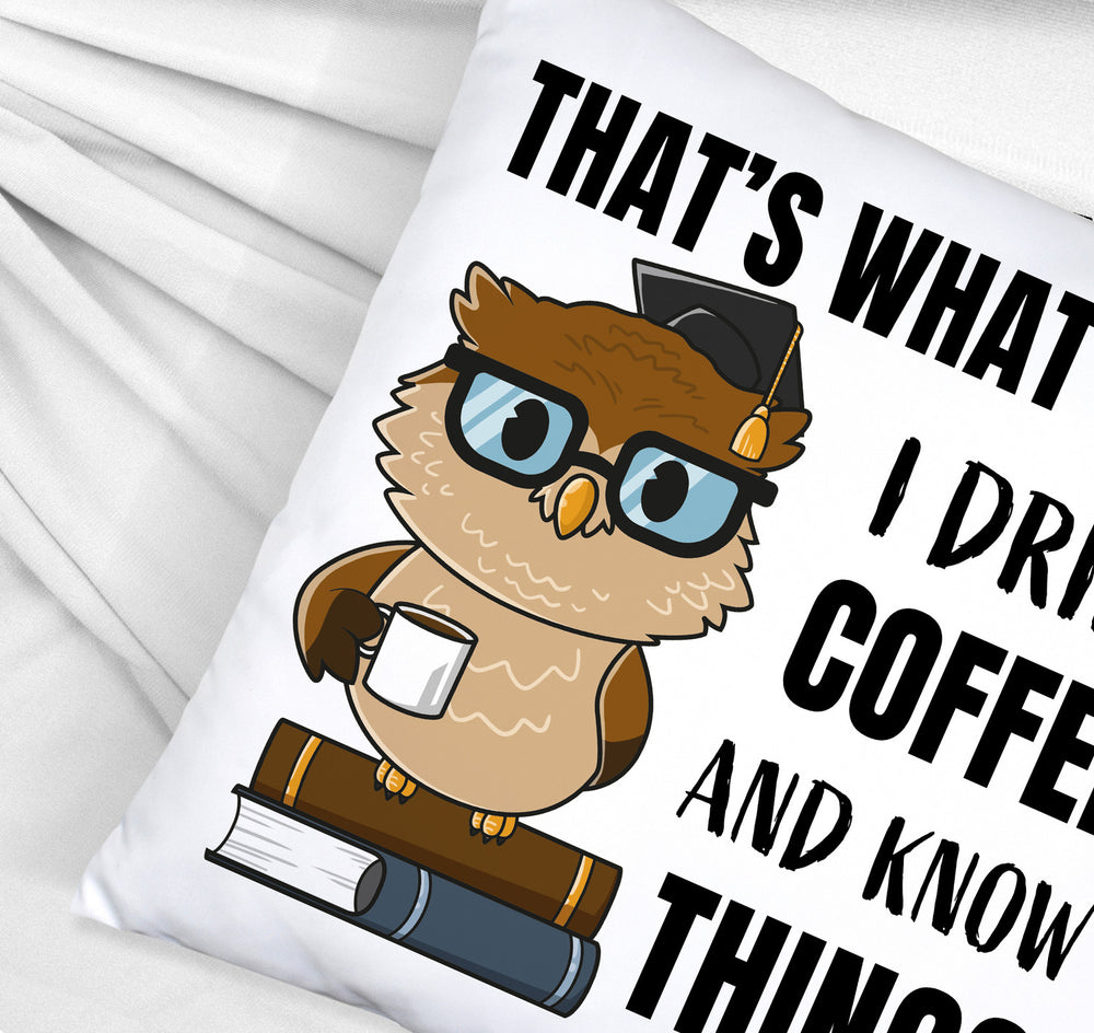 - Ob Geburtstag, Männertag oder einfach so – dieses spitzenmäßige Eule Kissen ist das Must-have für jeden Schlaumeier, der Humor hat und gerne prahlt: Seht her, ich trinke Kaffee und weiß Dinge!