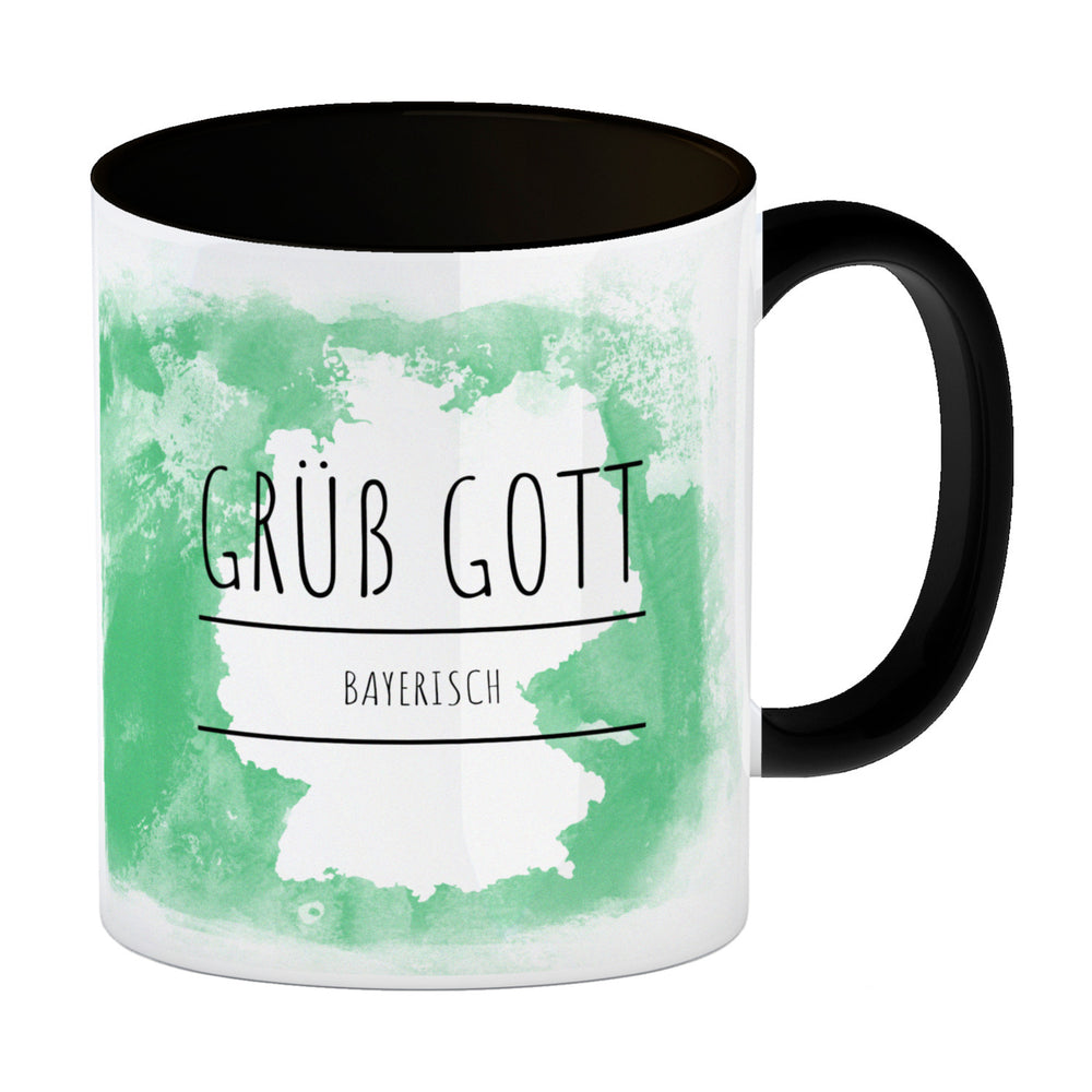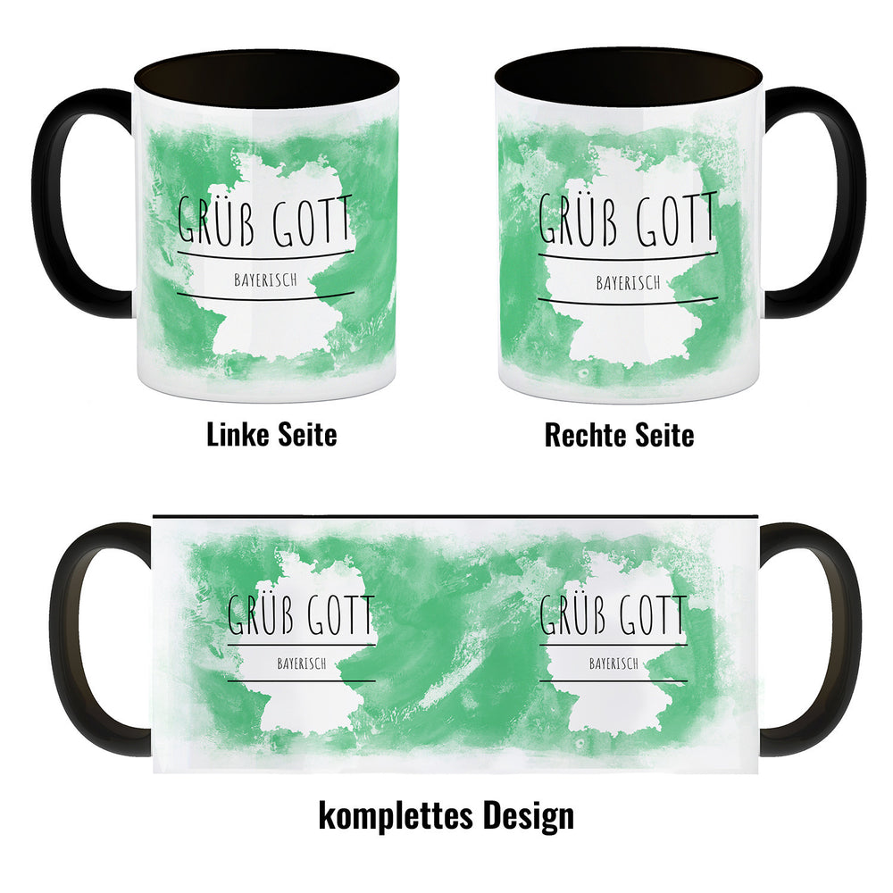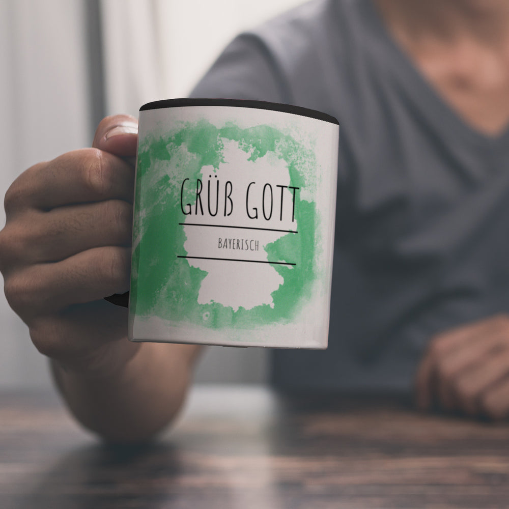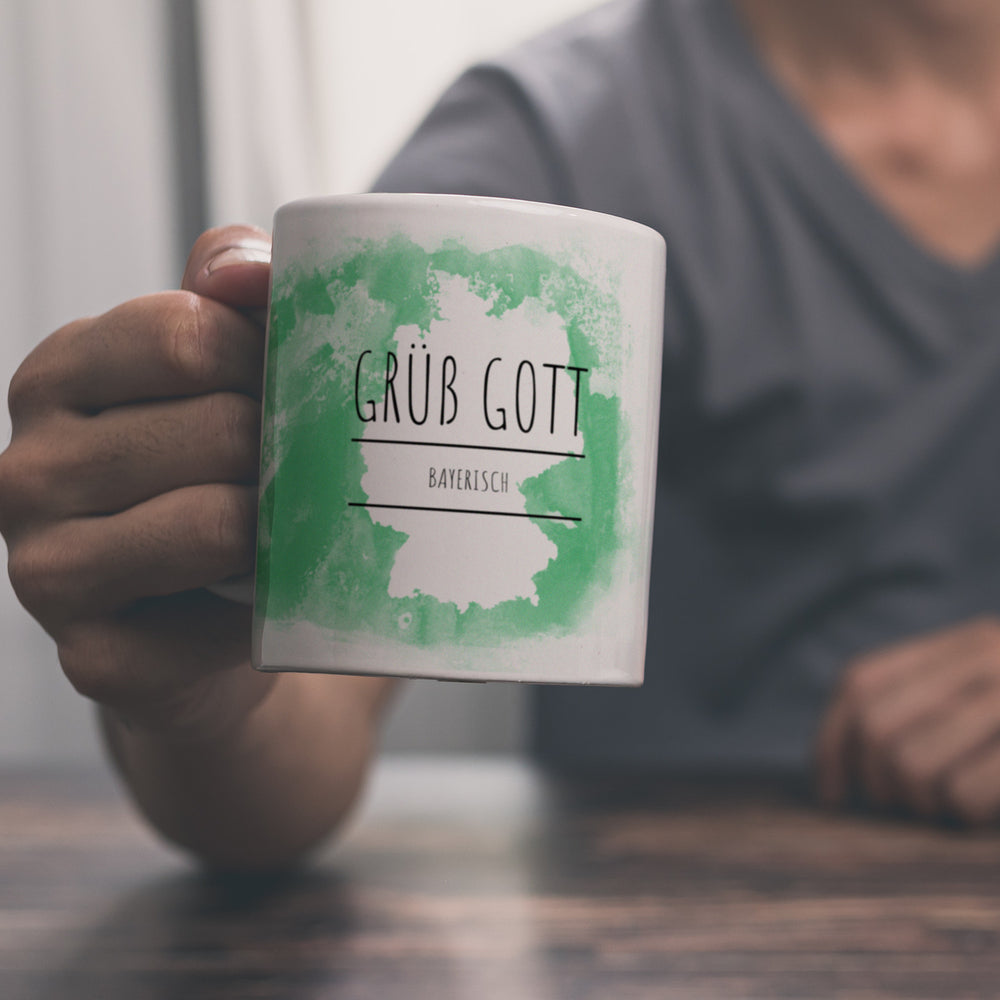 - 1x Hallo auf Bayerisch Grüß Gott lustiger Kaffeebecher mit grünem Hintergrund in der gewählten Ausführung