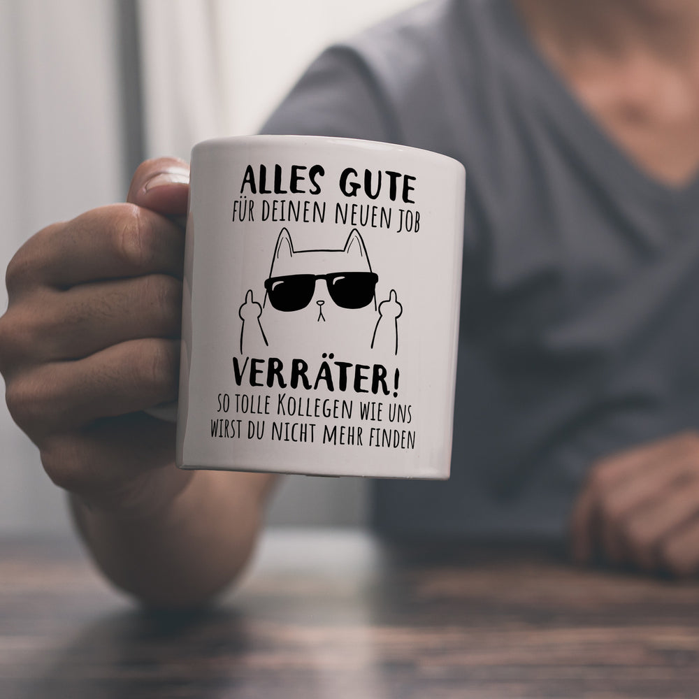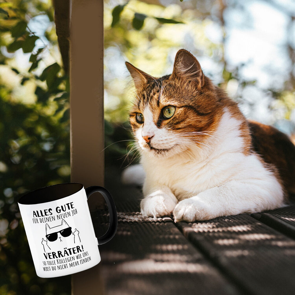 • 1x Katze mit Mittelfinger Kaffeebecher mit Spruch Viel Erfolg du Verräter in der gewählten Ausführung