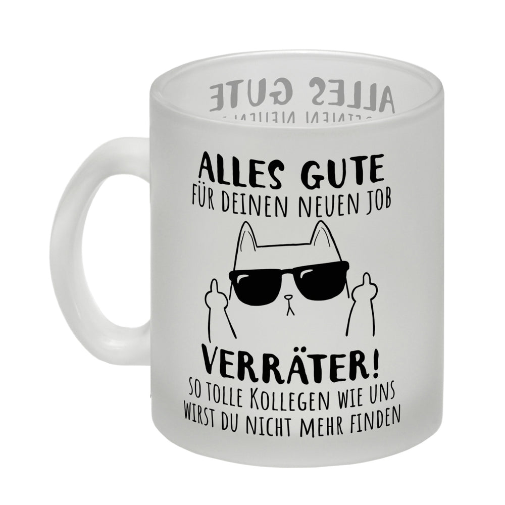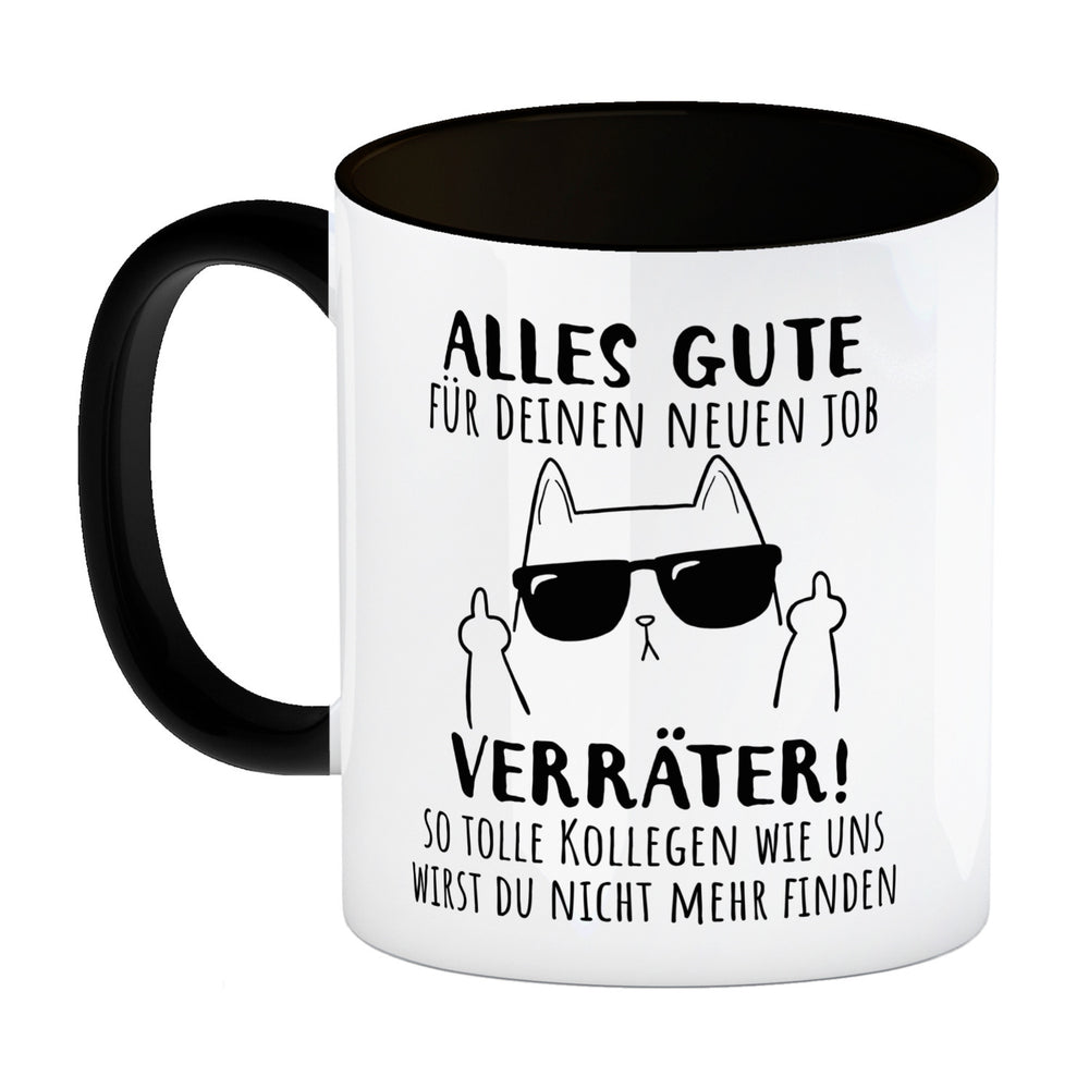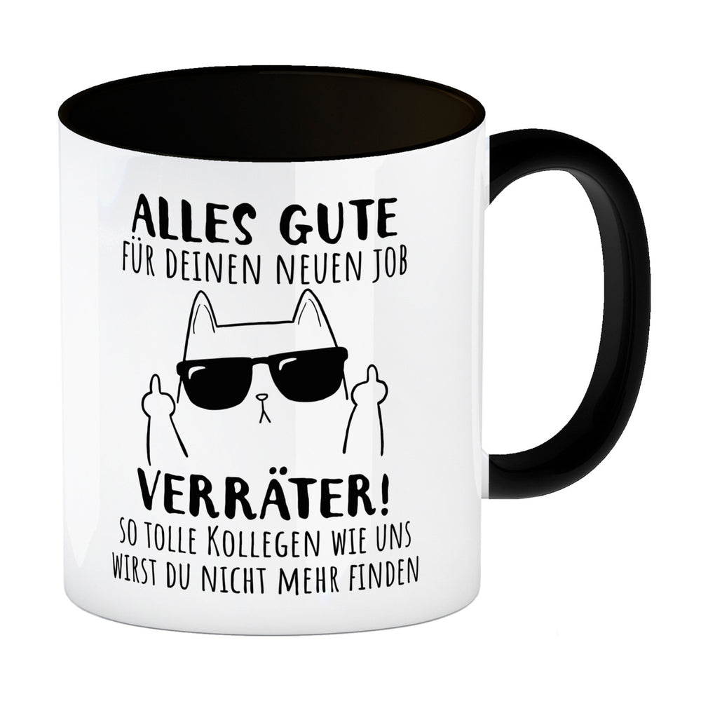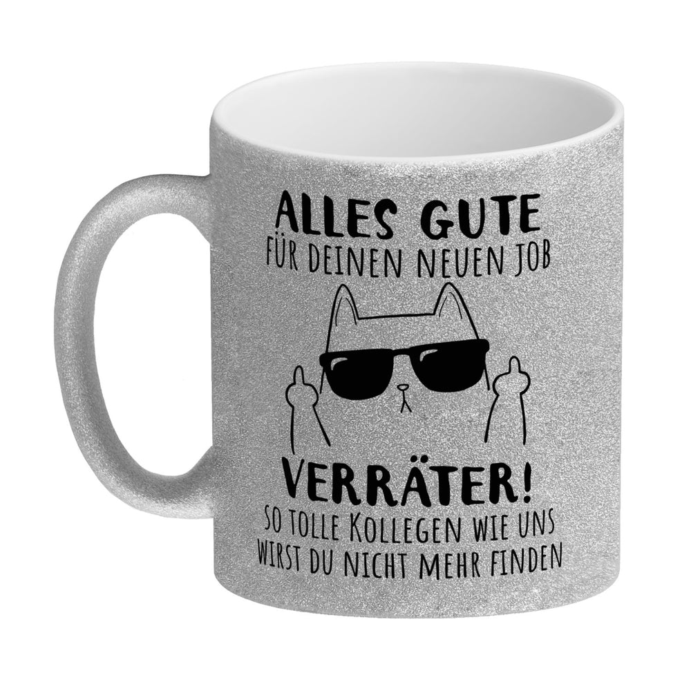 Verabschiede deinen Kollegen stilecht und mit Humor mit unserem einzigartigen Katze mit Mittelfinger Kaffeebecher! Zeige ihm, wie sehr er gefeiert wird und wie sehr er fehlen wird. Mit diesem Becher wird jeder Kaffee zu einem kleinen Fest. Das ideale Abschiedsgeschenk, das die Bürolegende weiterleben lässt!Kennst du einen Kollegen, der den Job wechselt? Mit einer Katze, die den Mittelfinger zeigt und dem frechen Spruch „Viel Erfolg du Verräter“ ist dieser Kaffeebecher einfach perfekt. Er bringt garantiert ein Lachen auf das Gesicht des Beschenkten und sorgt für unvergessliche Erinnerungen. Erhältlich in verschiedenen Ausführungen: als weiße Standardtasse, mit farbigem Henkel und Innenseite, als edle Glastasse, oder in einer glitzernden Silberedition.Suchst du nach einem Abschiedsgeschenk, das garantiert in Erinnerung bleibt und für Gesprächsstoff sorgt? Dann ist dieser Becher genau das Richtige! Perfekt für den täglichen Gebrauch im neuen Büro oder zu Hause, dient er als ständige Erinnerung an die guten alten Zeiten mit den besten Kollegen und bringt auch an trüben Montagmorgen gute Laune.Die Kombination aus Praktikabilität und einem unvergesslich humorvollen Design macht diesen Kaffeebecher zum optimalen Geschenk für jeden Kollegenwechsel. Zeige, wie sehr ihr den Kollegen geschätzt habt – und dass er definitiv vermisst wird!
