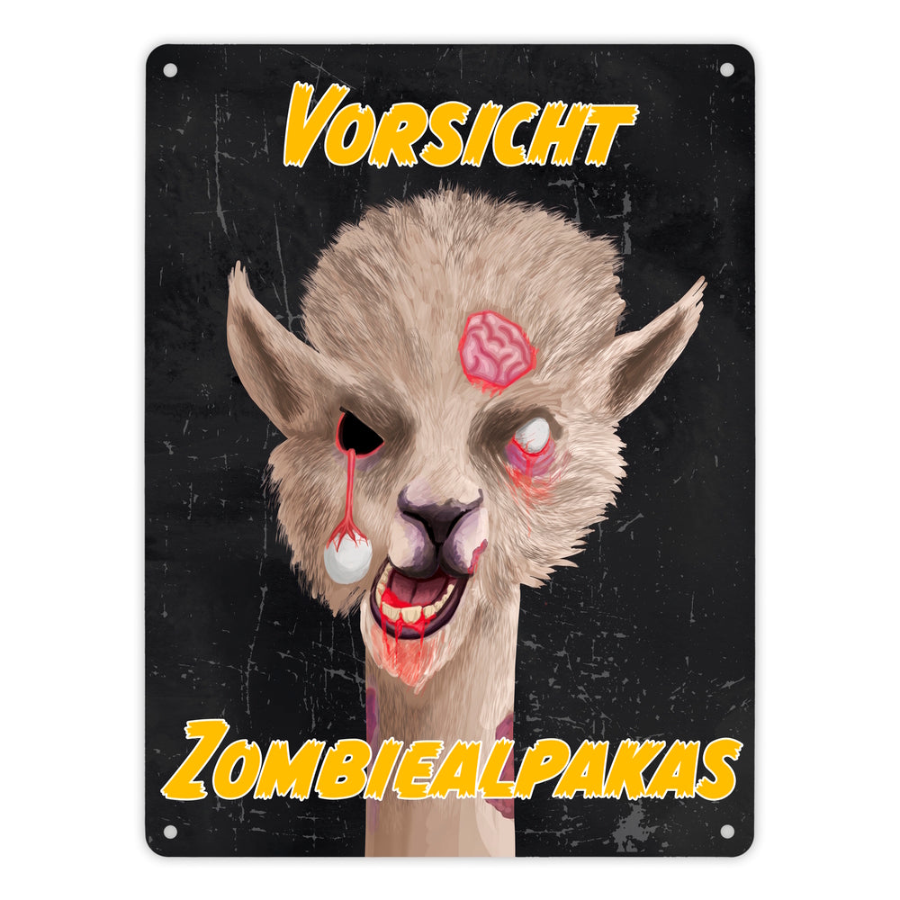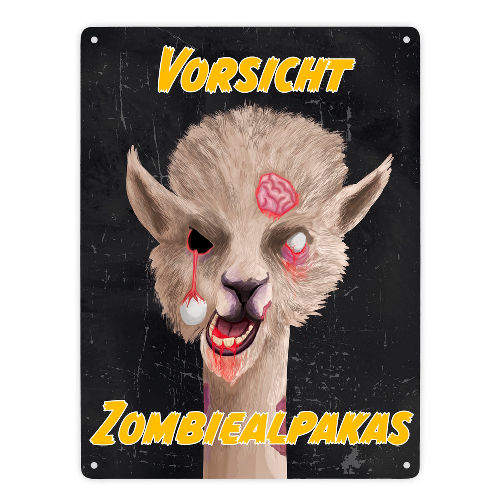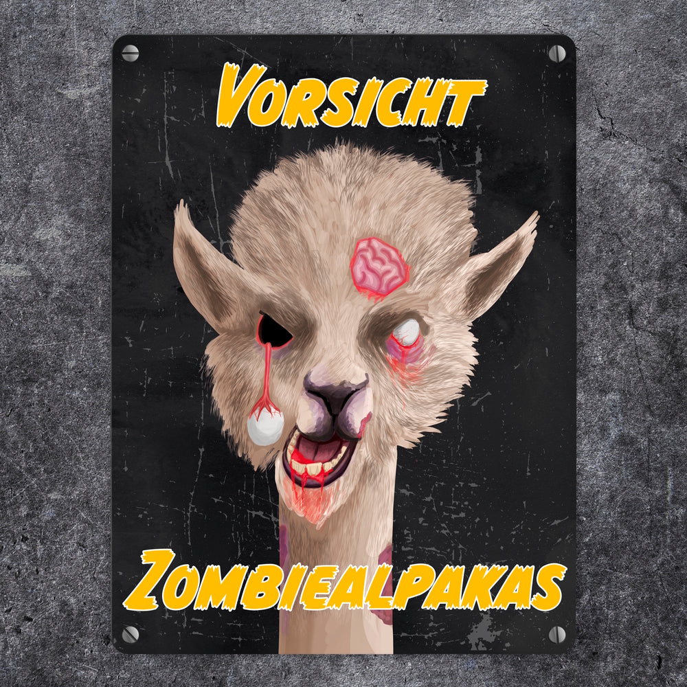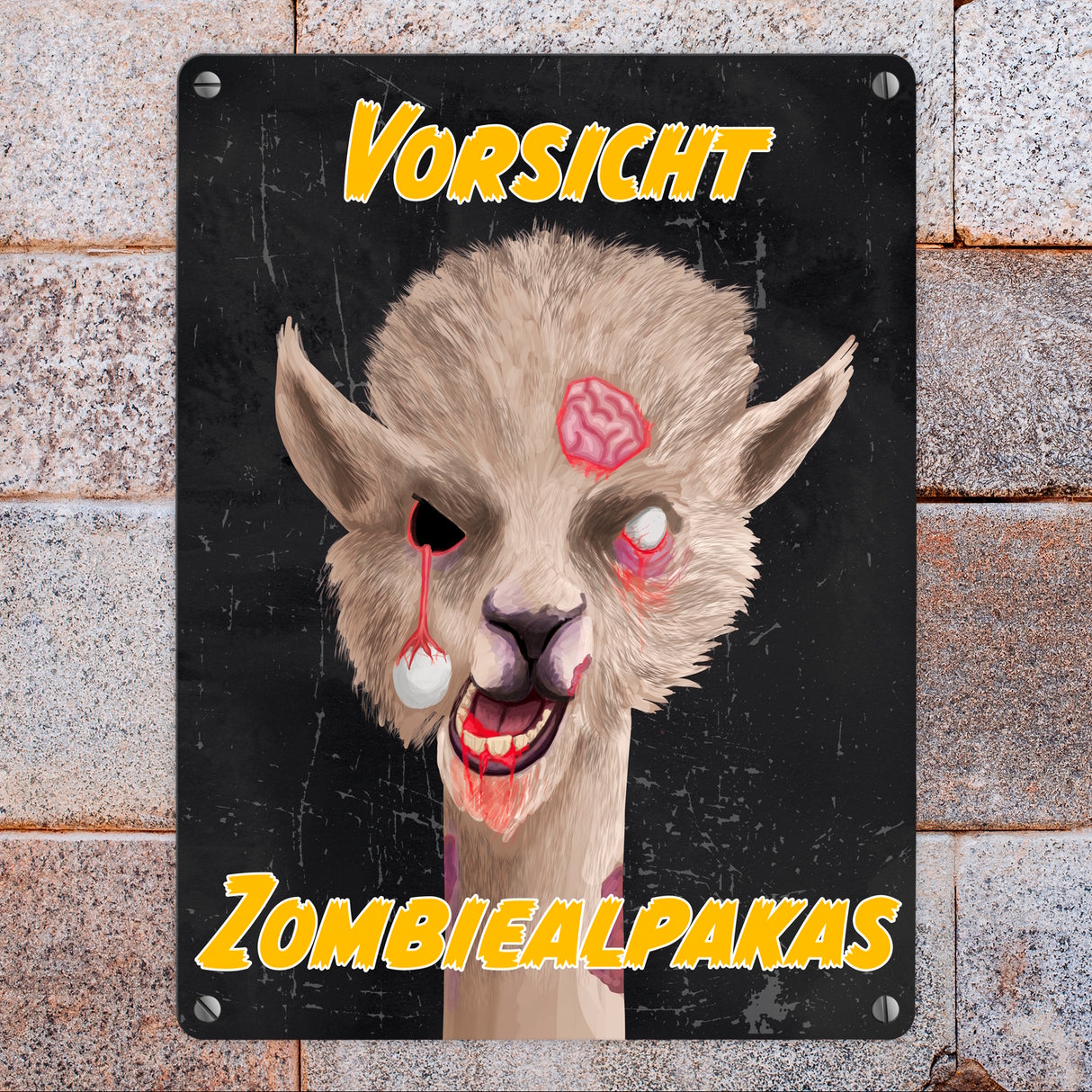 Vorsicht Zombiealpaka Metallschild in dunkelgrau