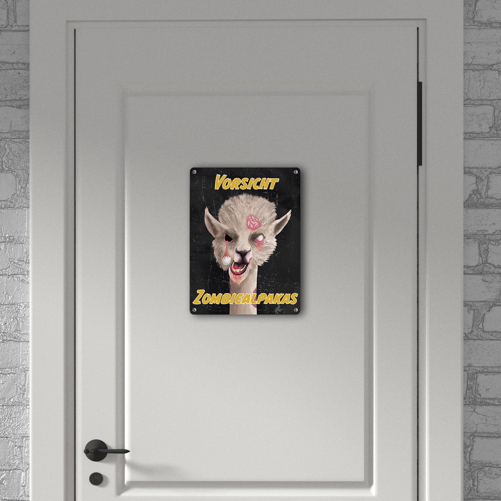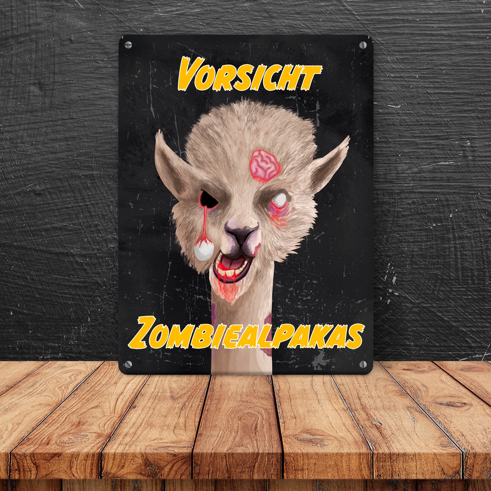 - 1x Vorsicht Zombiealpaka Metallschild in dunkelgrau in der gewählten Größe