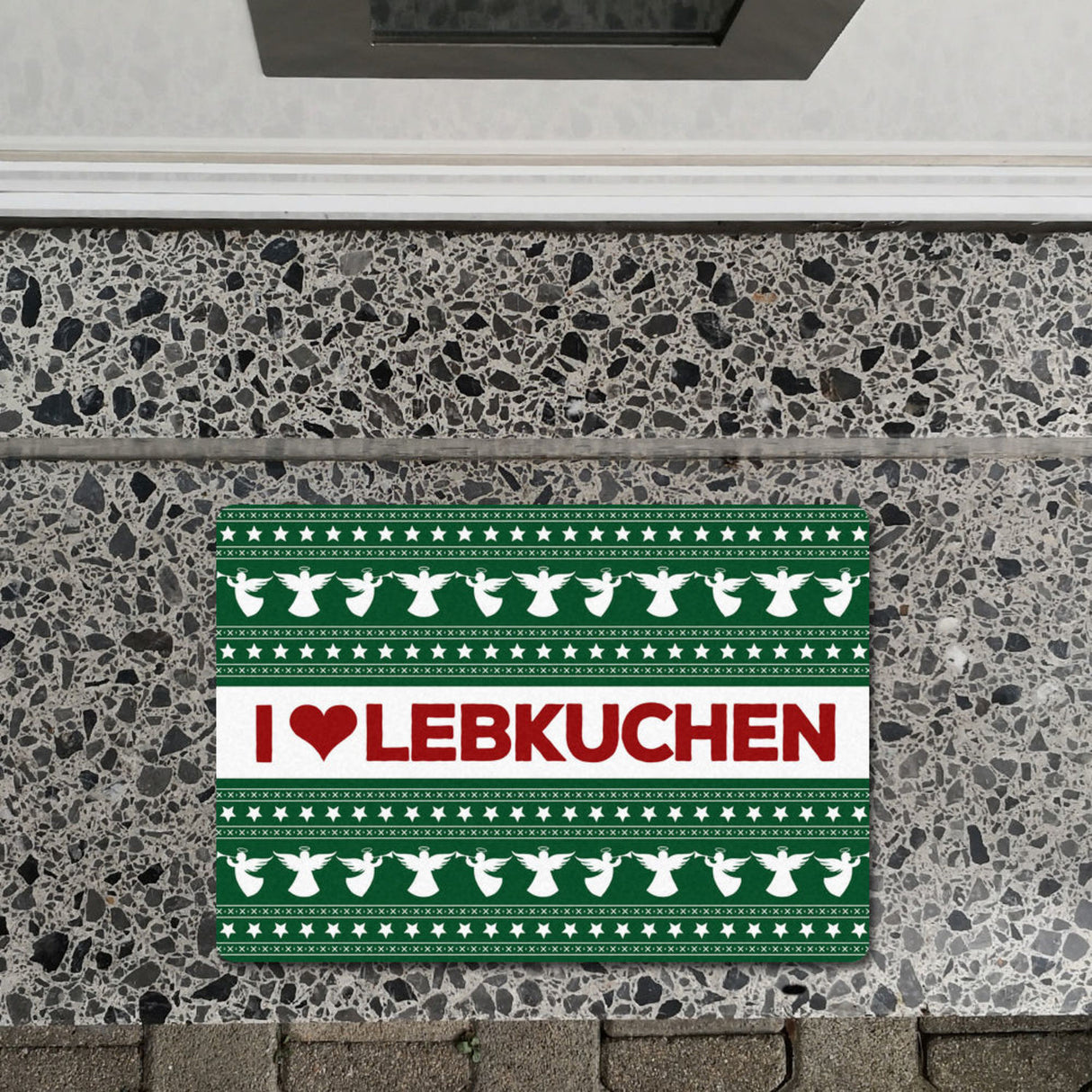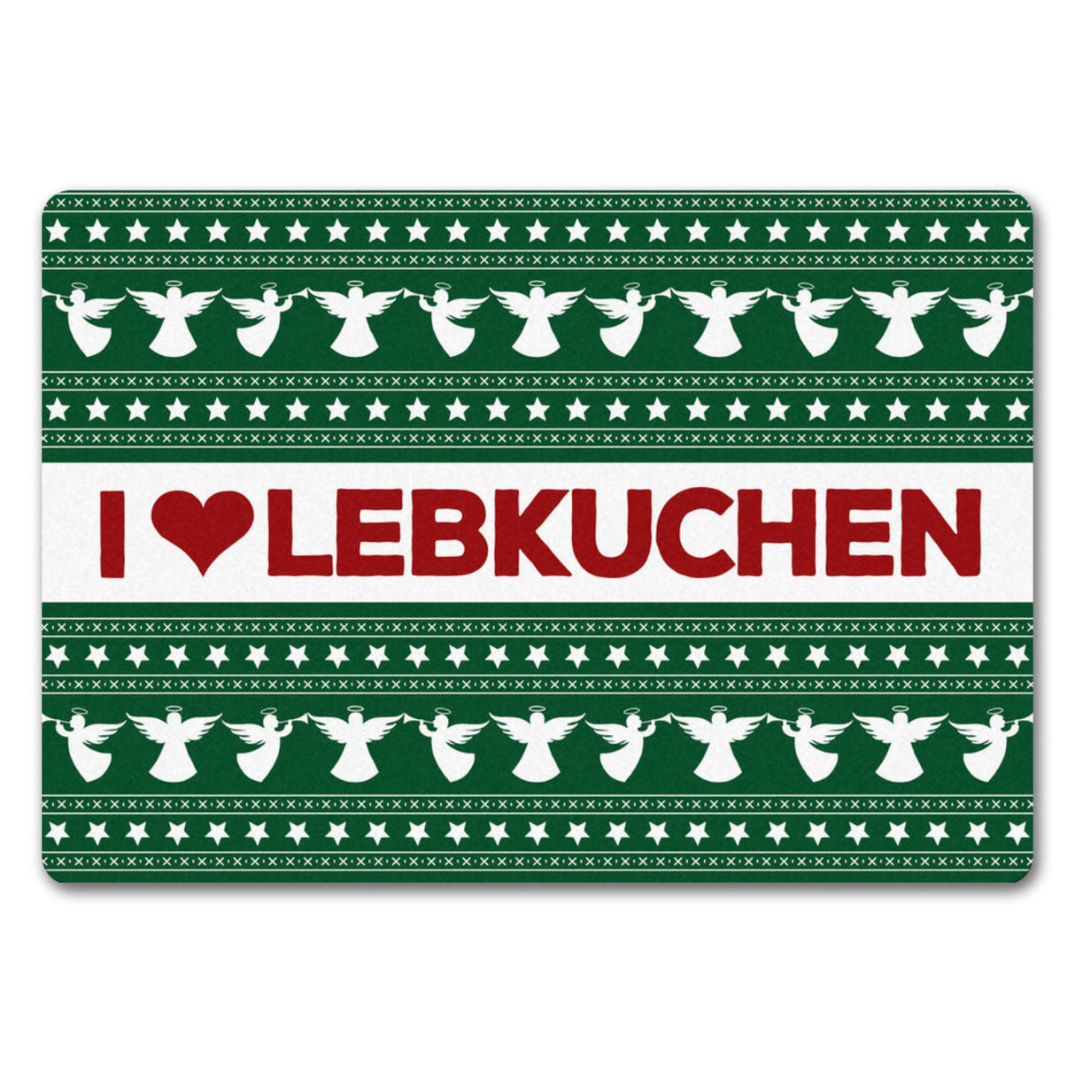 • Lieferumfang: 1x I love Lebkuchen Fußmatte ohne Rand in grün mit Weihnachtsmuster Motiv