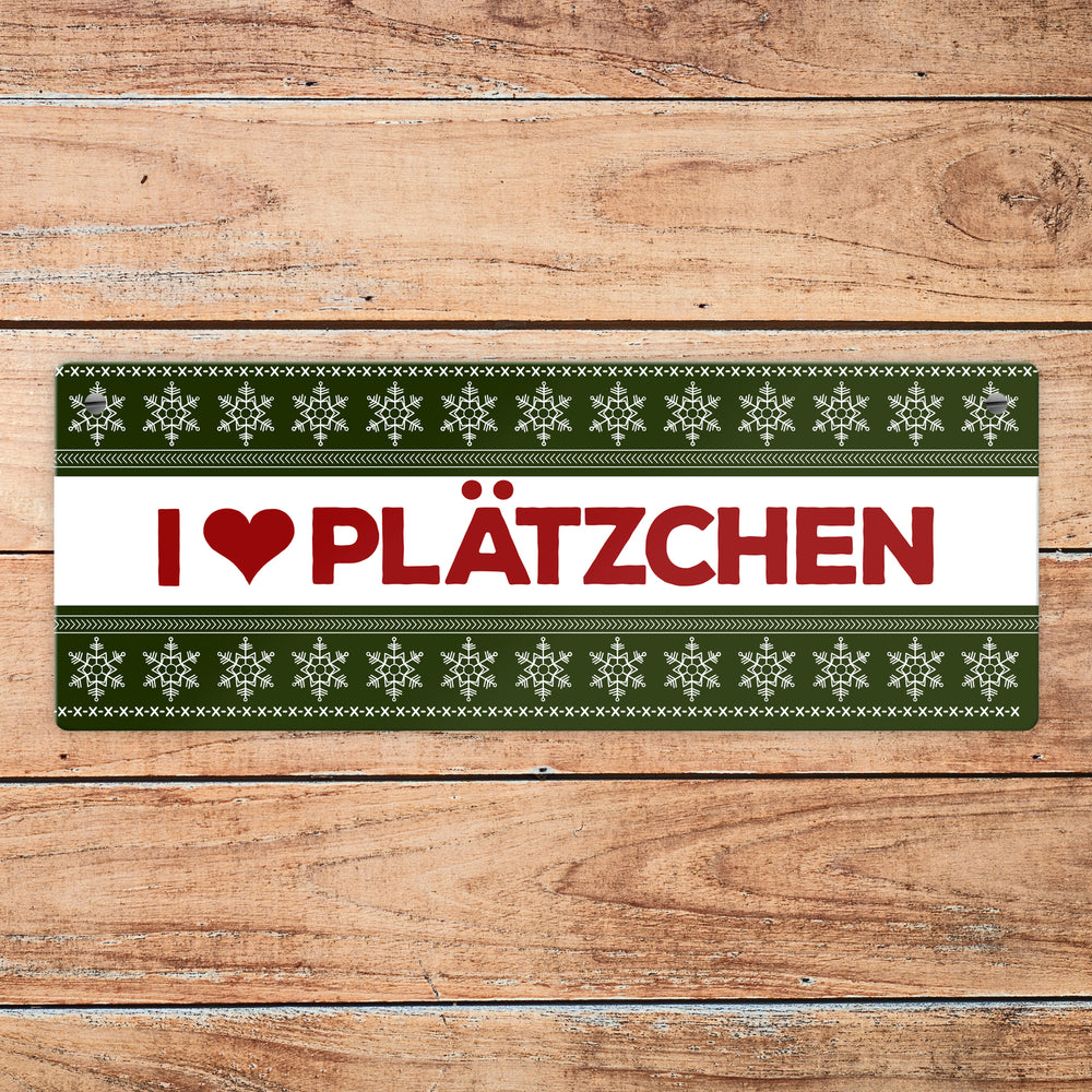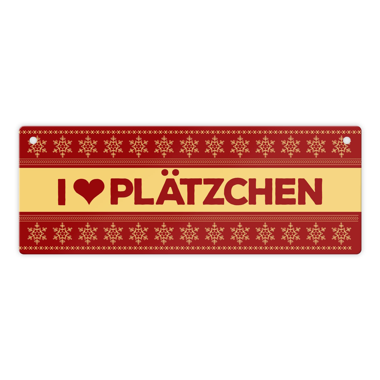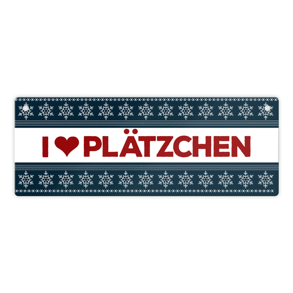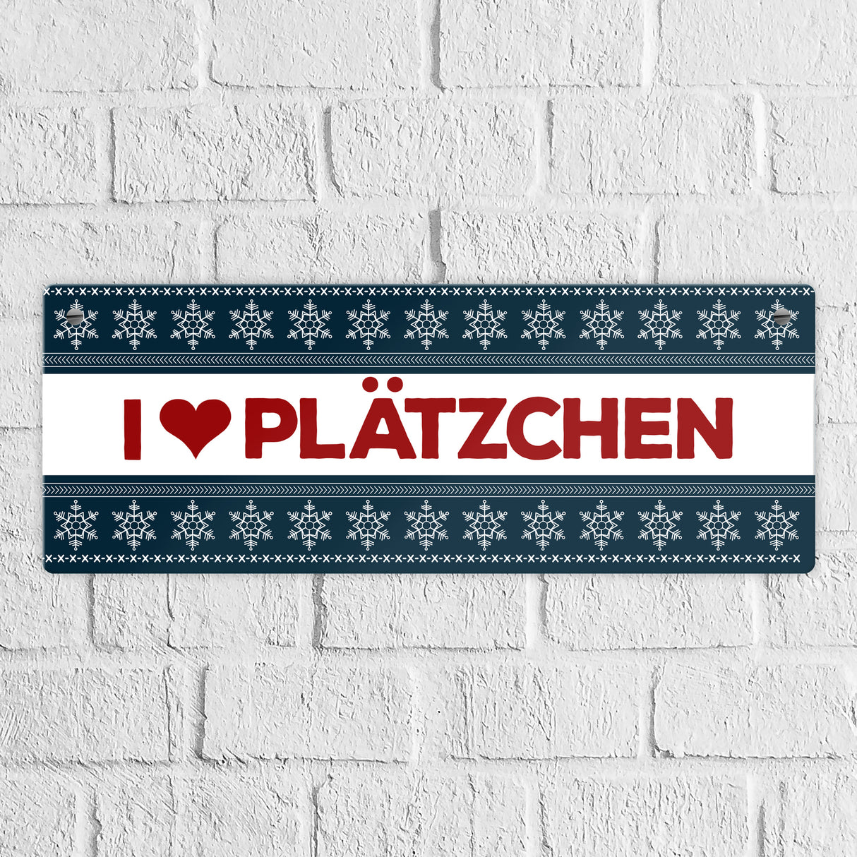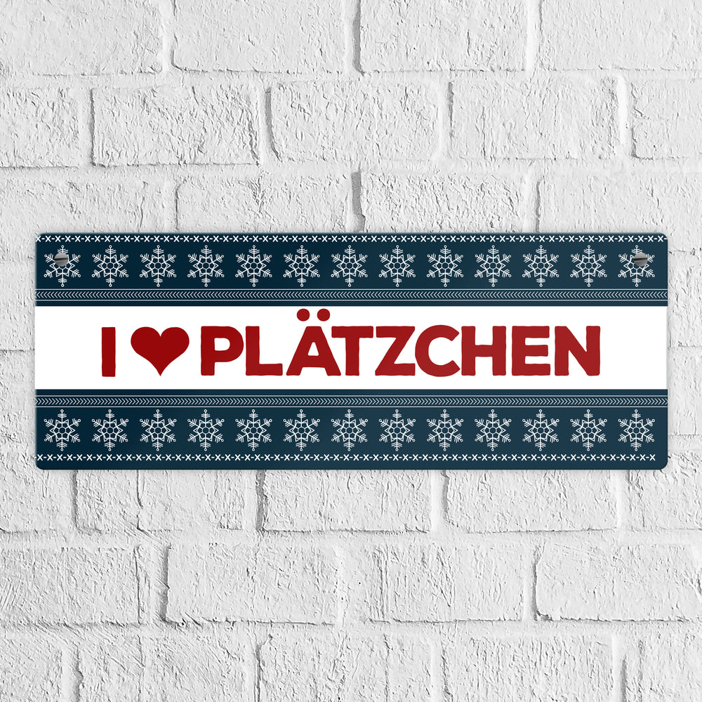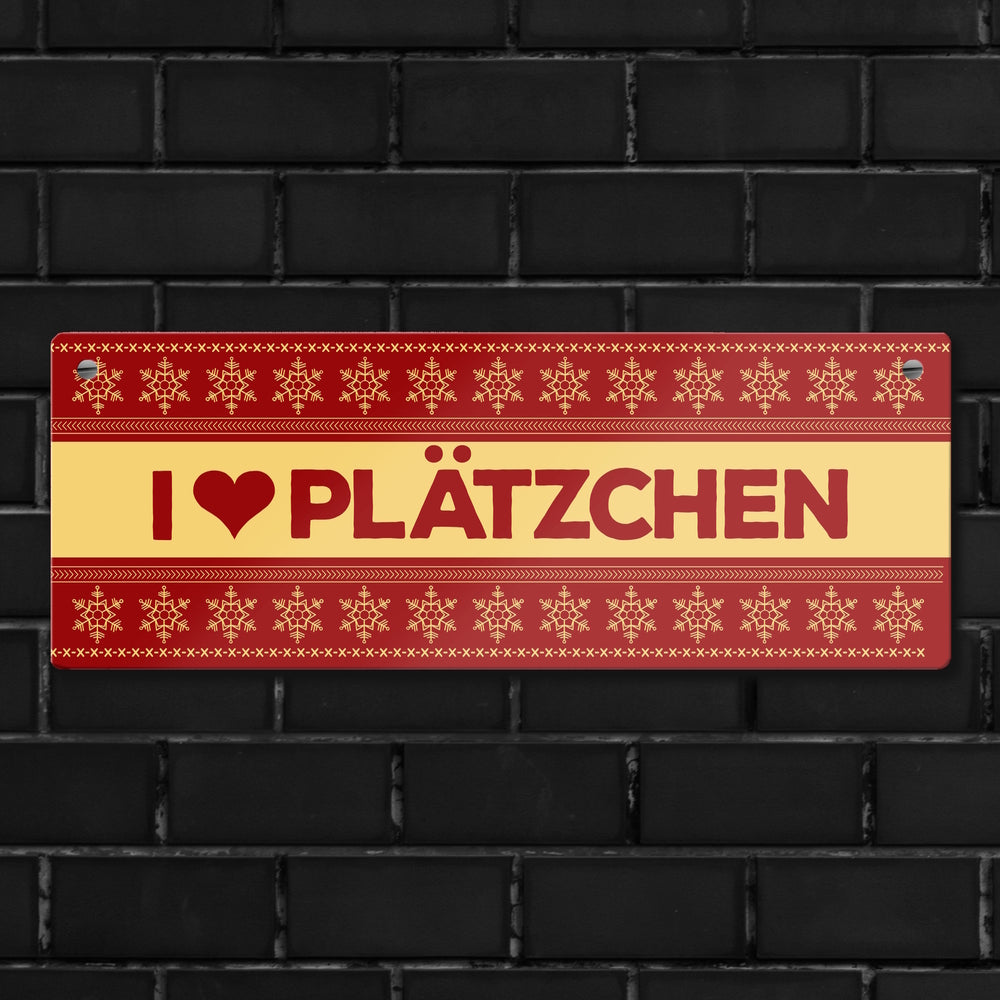 - 1x I love Plätzchen Metallschild mit Weihnachtsmuster Motiv - Weihnachten Herz Schnee Sterne Punkte Muster in der gewählten Größe
