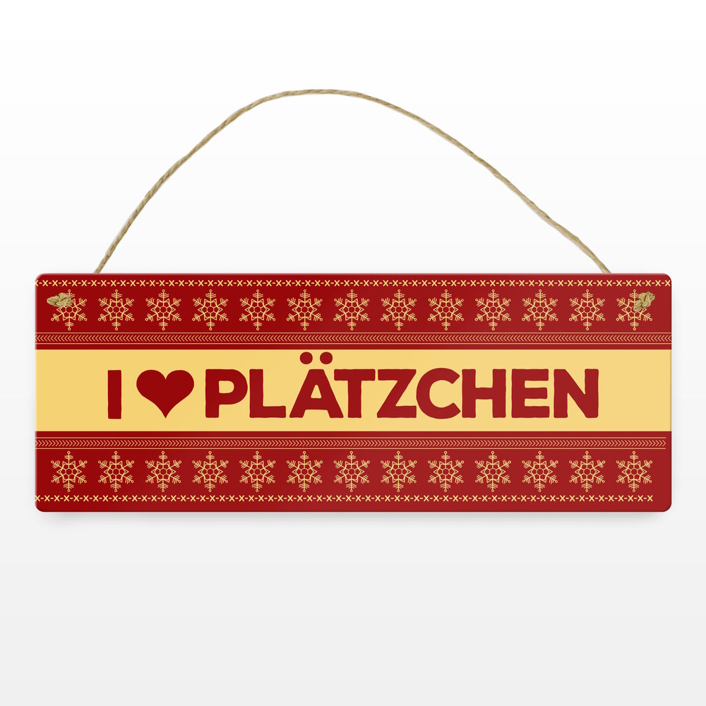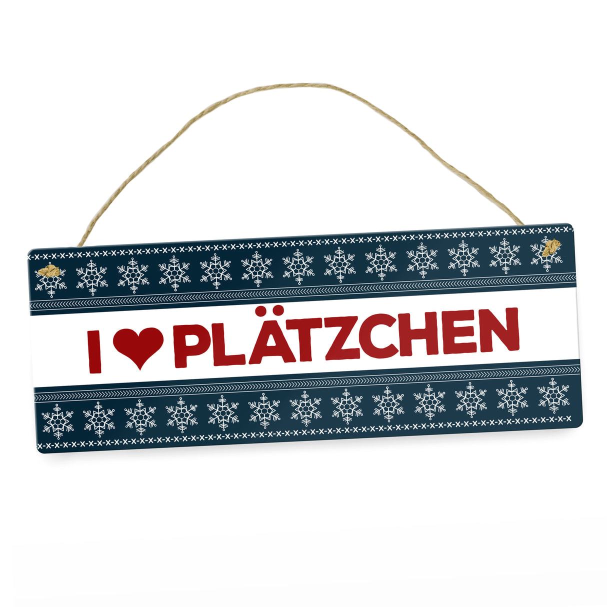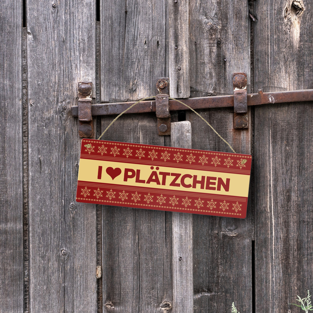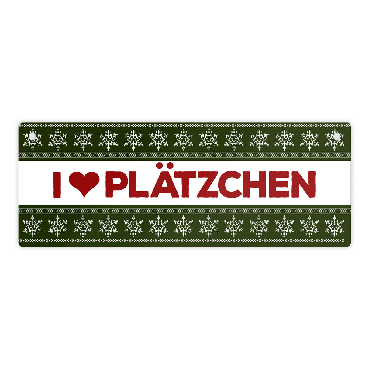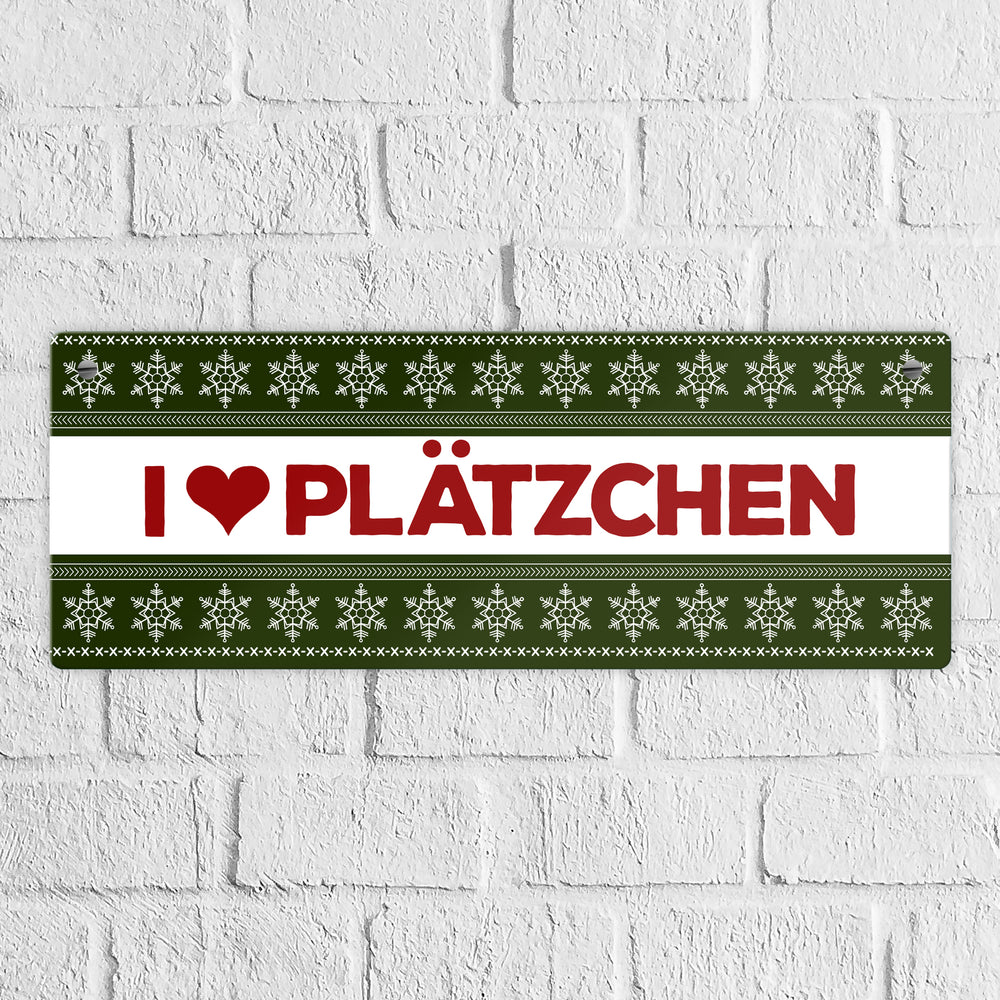 - 1x I love Plätzchen Metallschild mit Weihnachtsmuster Motiv - Weihnachten Herz Schnee Sterne Punkte Muster in der gewählten Größe