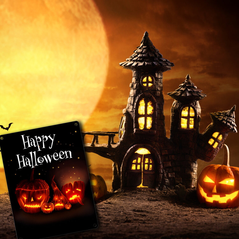 - 1x Metallschild mit gruseligem Kürbis Motiv und Happy Halloween Schriftzug in der gewählten Größe