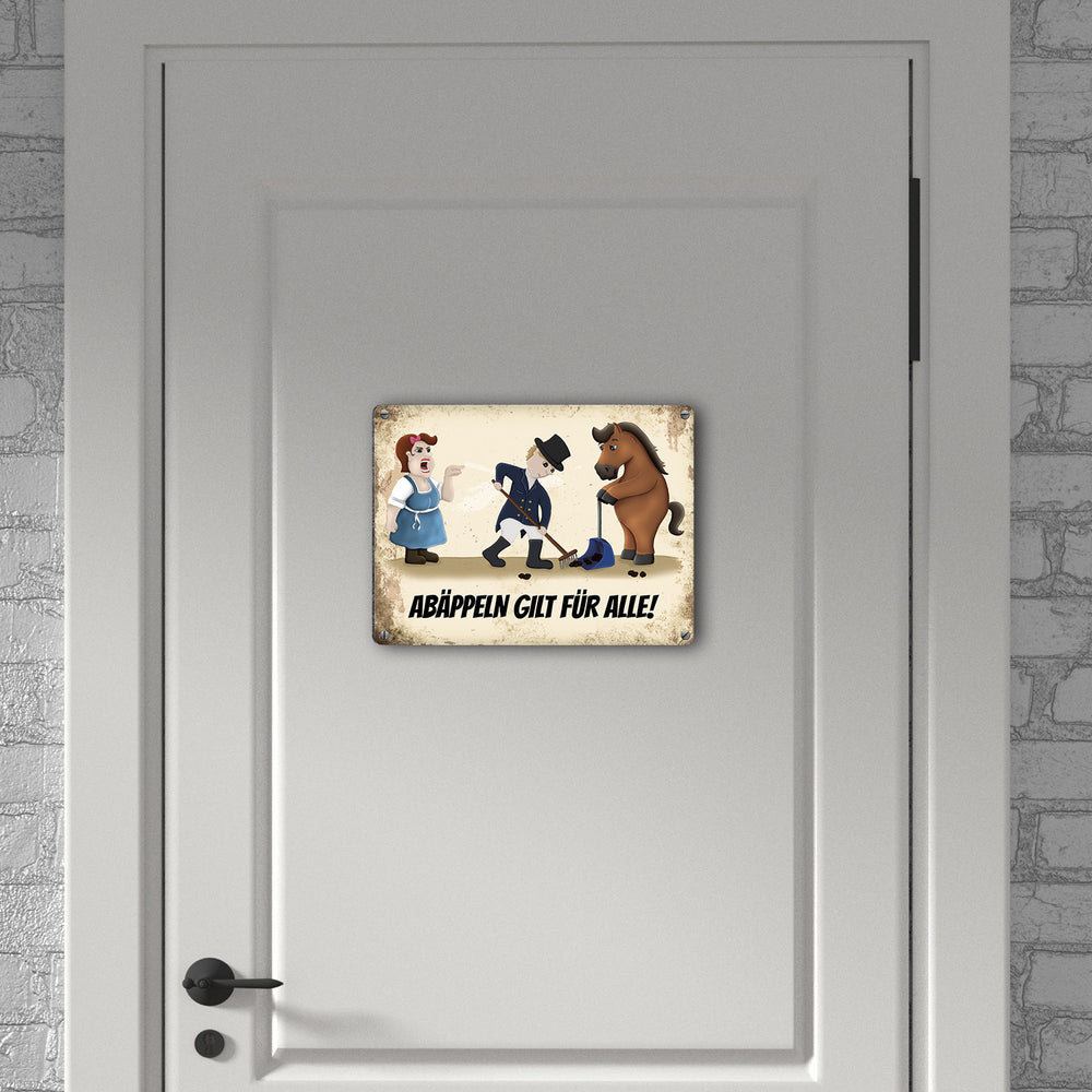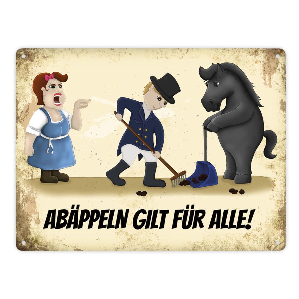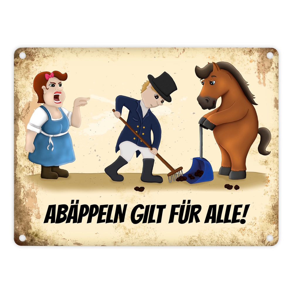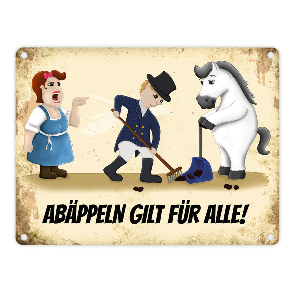 • 1x Metallschild mit Reiter und Pferde Motiv und Spruch: Abäppeln gilt für alle Absammeln Pferdeäpfel Reithalle Stall in der gewählten Größe