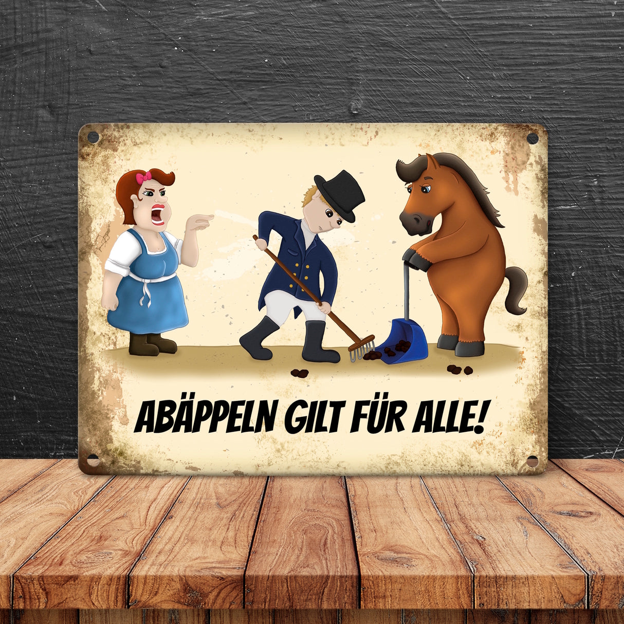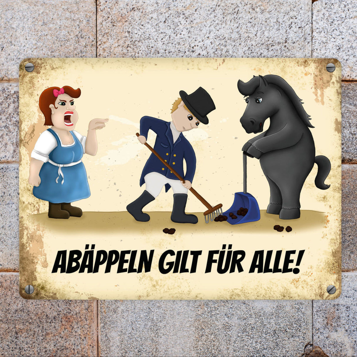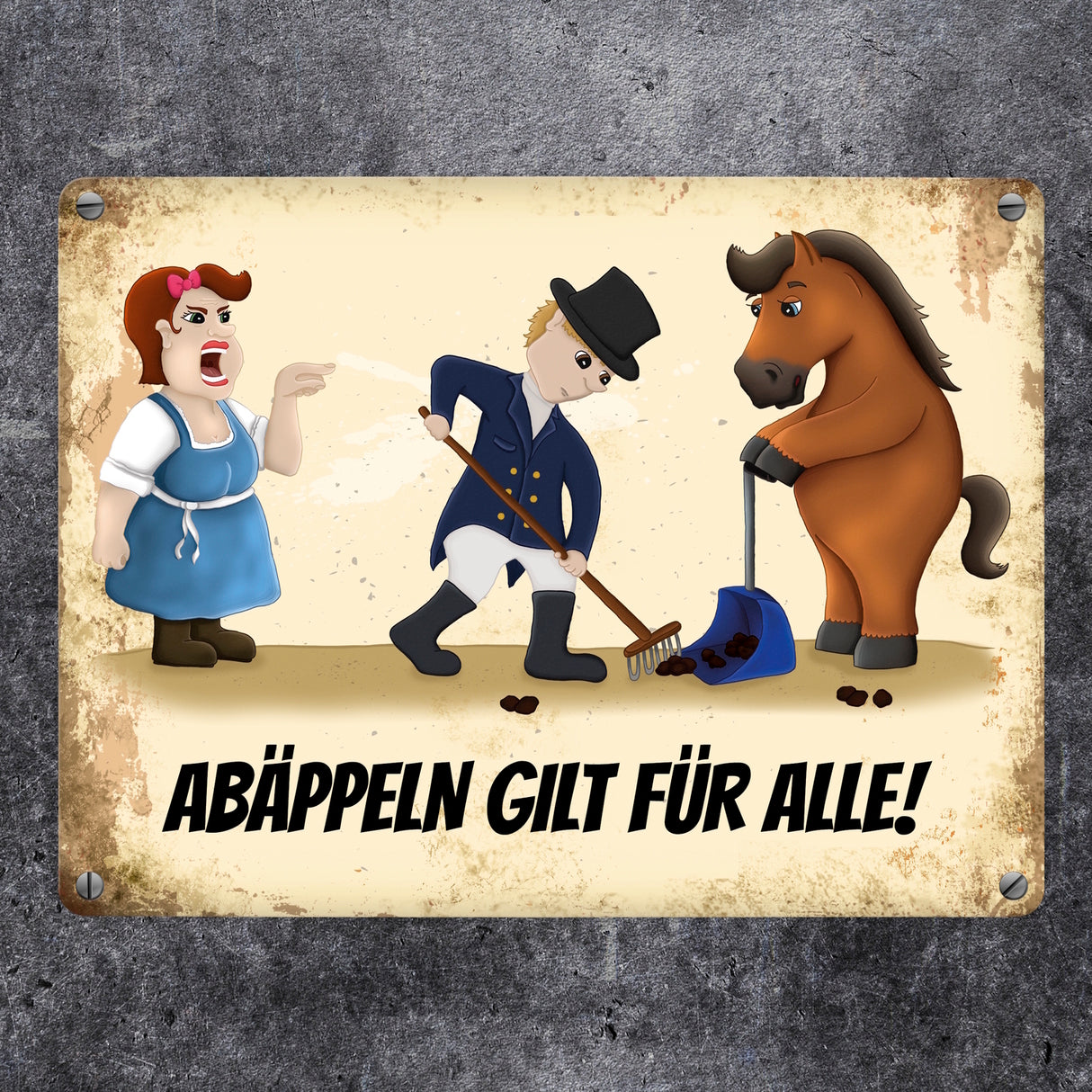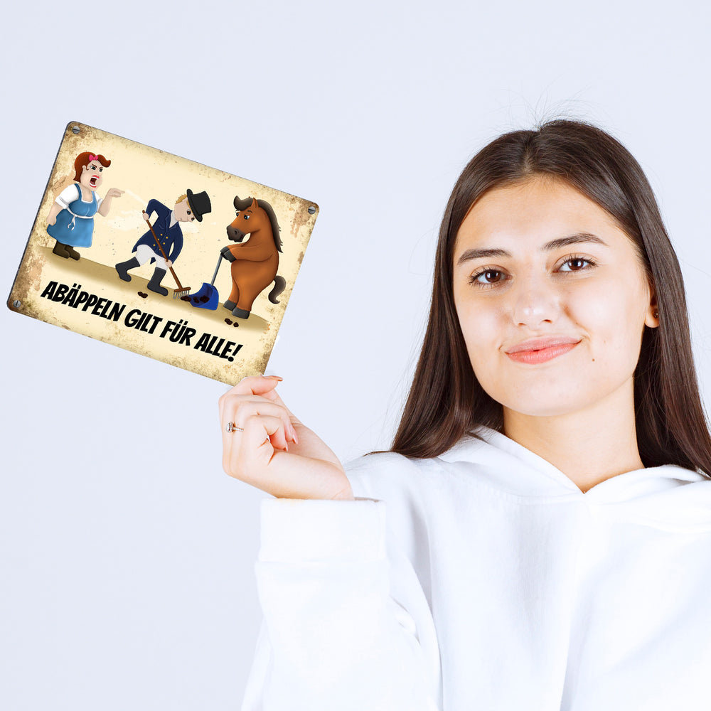 • 1x Metallschild mit Reiter und Pferde Motiv und Spruch: Abäppeln gilt für alle Absammeln Pferdeäpfel Reithalle Stall in der gewählten Größe