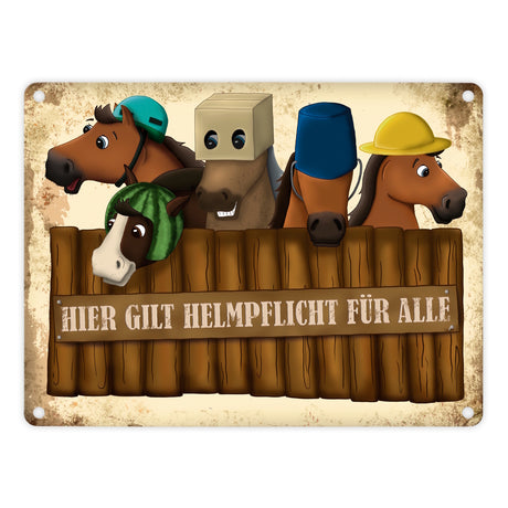 Metallschild mit Reiter und Pferde Motiv und Spruch: Hier gilt Helmpflicht für alle