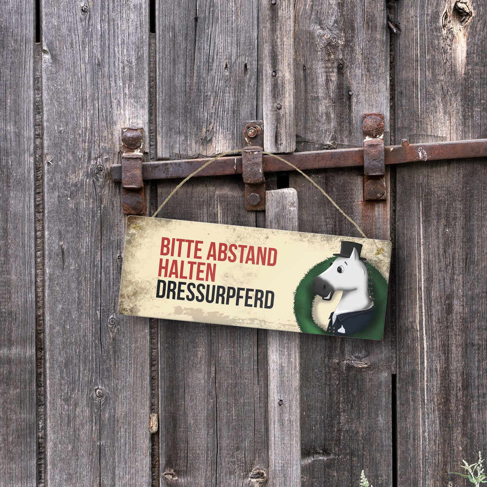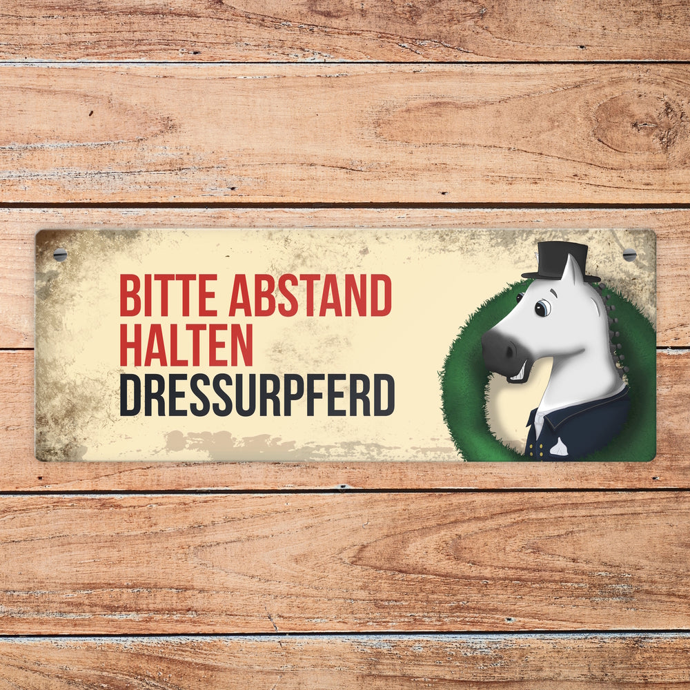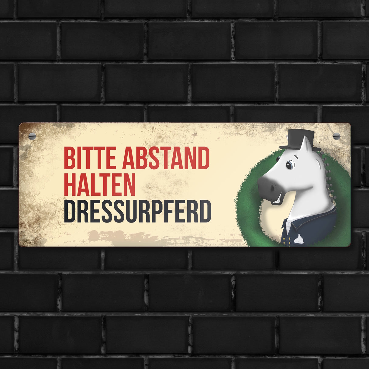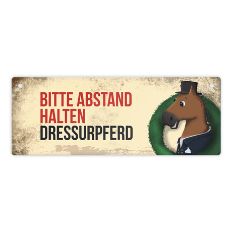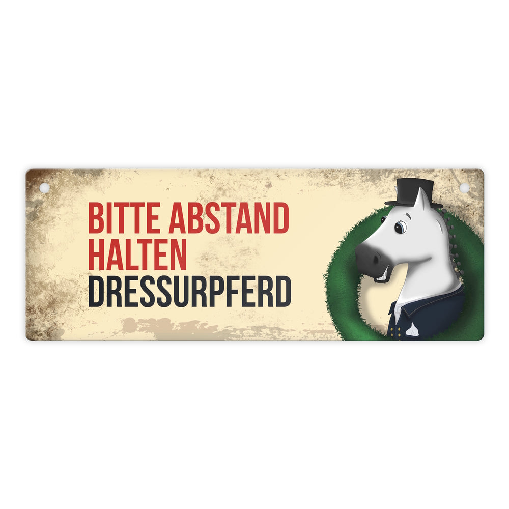 - 1x Metallschild mit weißem Dressurpferd Motiv und Spruch: Bitte Abstand halten in der gewählten Größe