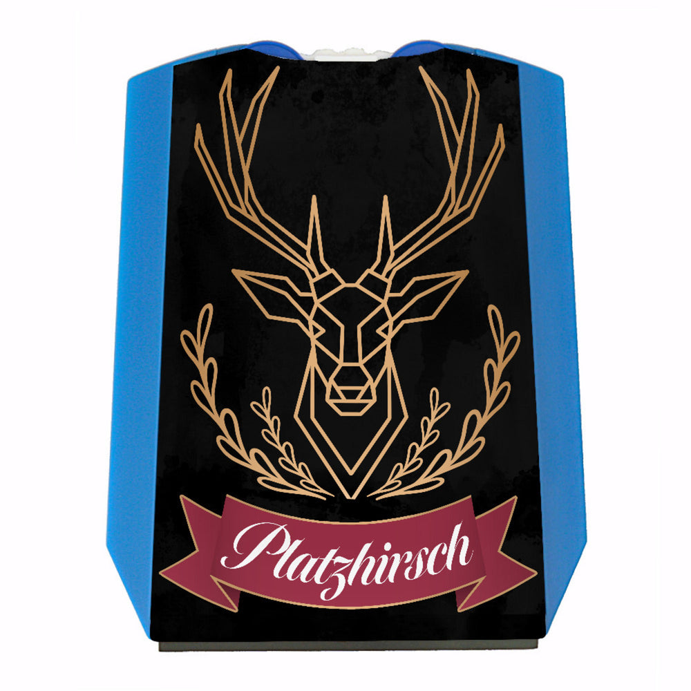 - Auf der Rückseite der Parkuhr ist ein cooler Hirsch abgebildet. Darunter steht in geschwungener Schrift Platzhirsch: Damit allen sofort klar ist, wem dieser Parkplatz gehört.