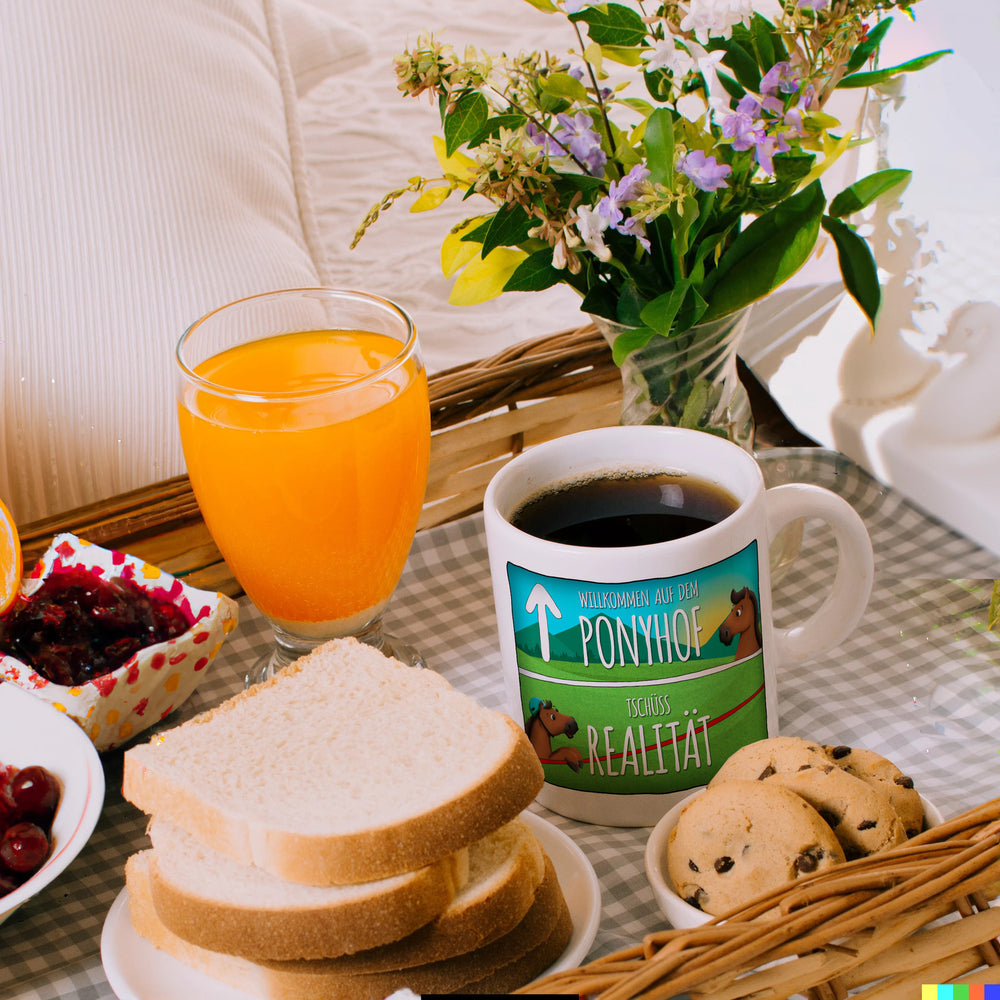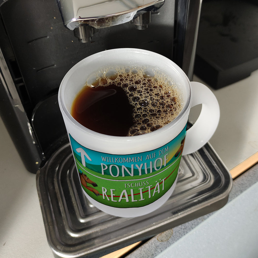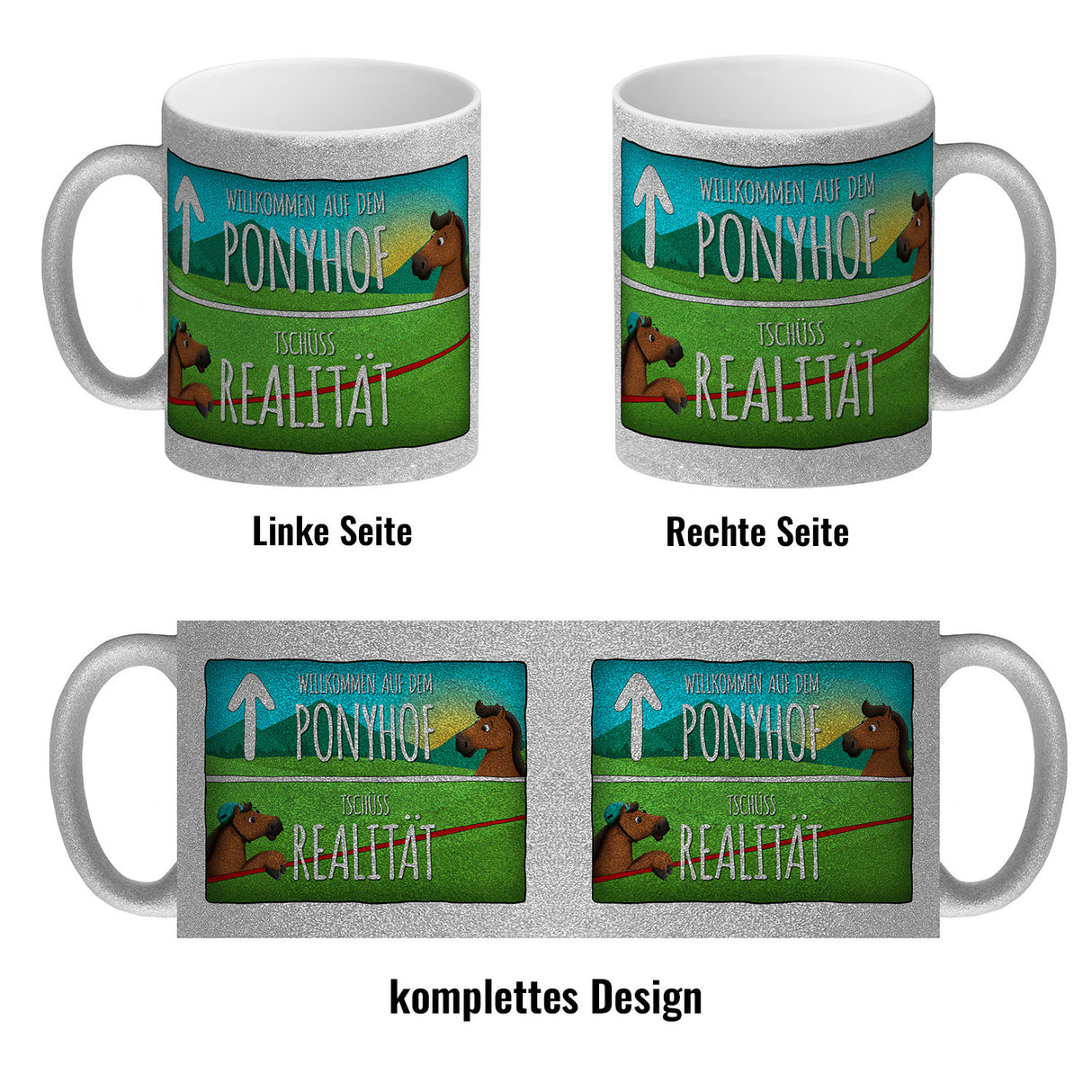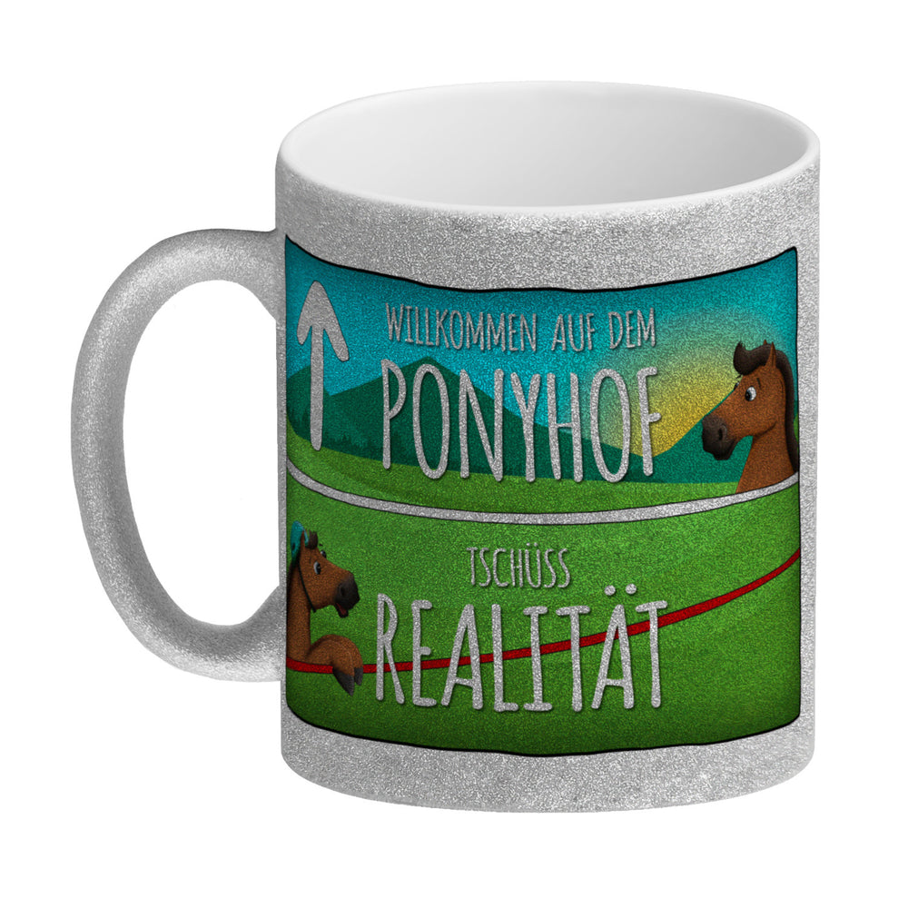 Willkommen auf dem Ponyhof - der perfekte Ort, um sich in die Welt des Pferdesports zu vertiefen. Und mit unserem Willkommen auf dem Ponyhof - Kaffeebecher können Sie dieses Gefühl jetzt auch zu Hause genießen. Erhältlich in verschiedenen Varianten, von der weißen Standardtasse bis hin zur exklusiven Silberedition mit Glitzereffekt. Jeder Becher wird mit viel Sorgfalt und Liebe in unserer Tassen-Manufaktur in Deutschland bedruckt. Mit einem Spruch versehen, der jedes Mal an den besonderen Moment erinnert, wenn man dem Ponyhof näher kommt. Eine schöne Erinnerung für jeden Tag! Genießen Sie Ihren Kaffee oder Tee und lassen Sie sich dabei von der Magie des Reitsports inspirieren!