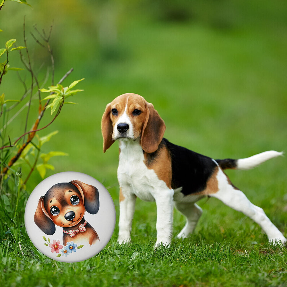 - Oh, schau mal da! Ein runder Magnet, der direkt ins Herz zieht: Unser Dackel mit Schleife! Mit seinem warmen, freundlichen Hundeblick und der chicen Schleife wird er sofort dein treuer Kühlschrank-Gefährte. Süß, charmant und einfach unwiderstehlich – ein echtes Schmuckstück für Dackel-Fans!