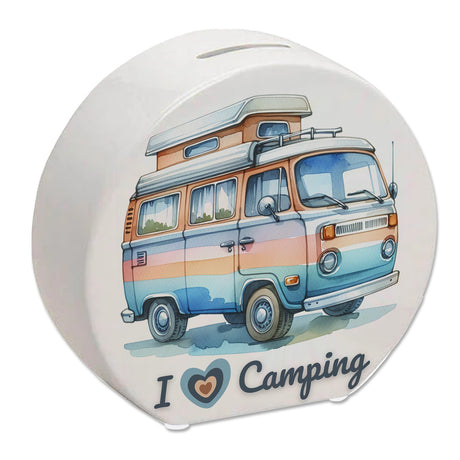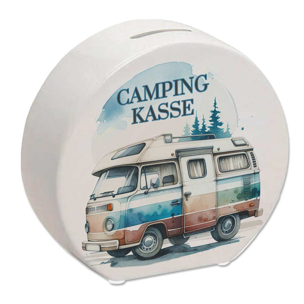 Spardose aus Keramik mit Camper Motiv und Text - Wohnwagen im Wald Campingkasse