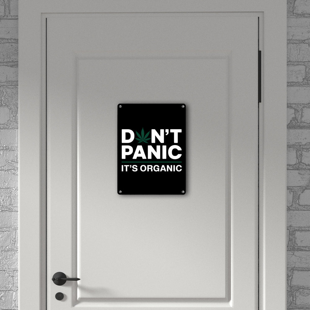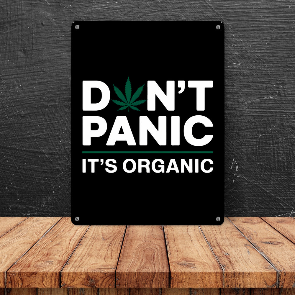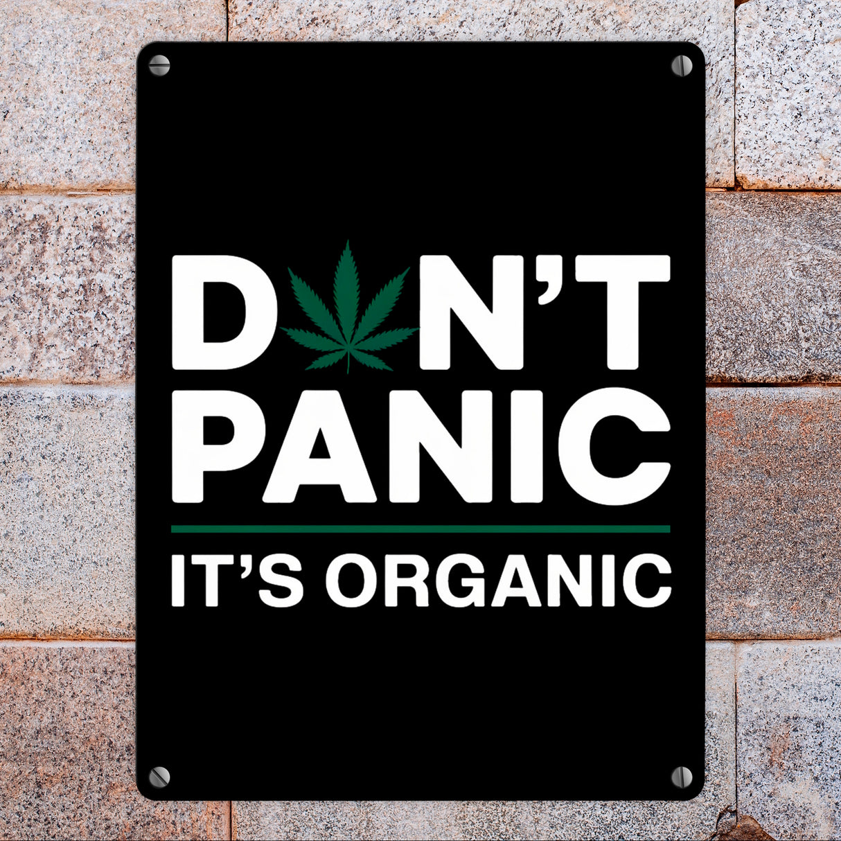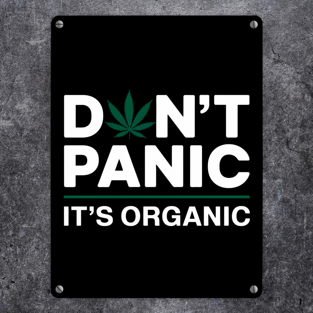 - Dieses humorvolle Metallschild zeigt ein originelles Cannabisblatt-Meme-Design. Auf einem schwarzen Hintergrund befindet sich ein auffälliges grünes Cannabisblatt. Der lustige Text "DON'T PANIC, IT'S ORGANIC" in weißen Buchstaben sorgt für Schmunzeln. Eine perfekte Ergänzung für jede Wand, die ein bisschen Humor und Charme vertragen kann.