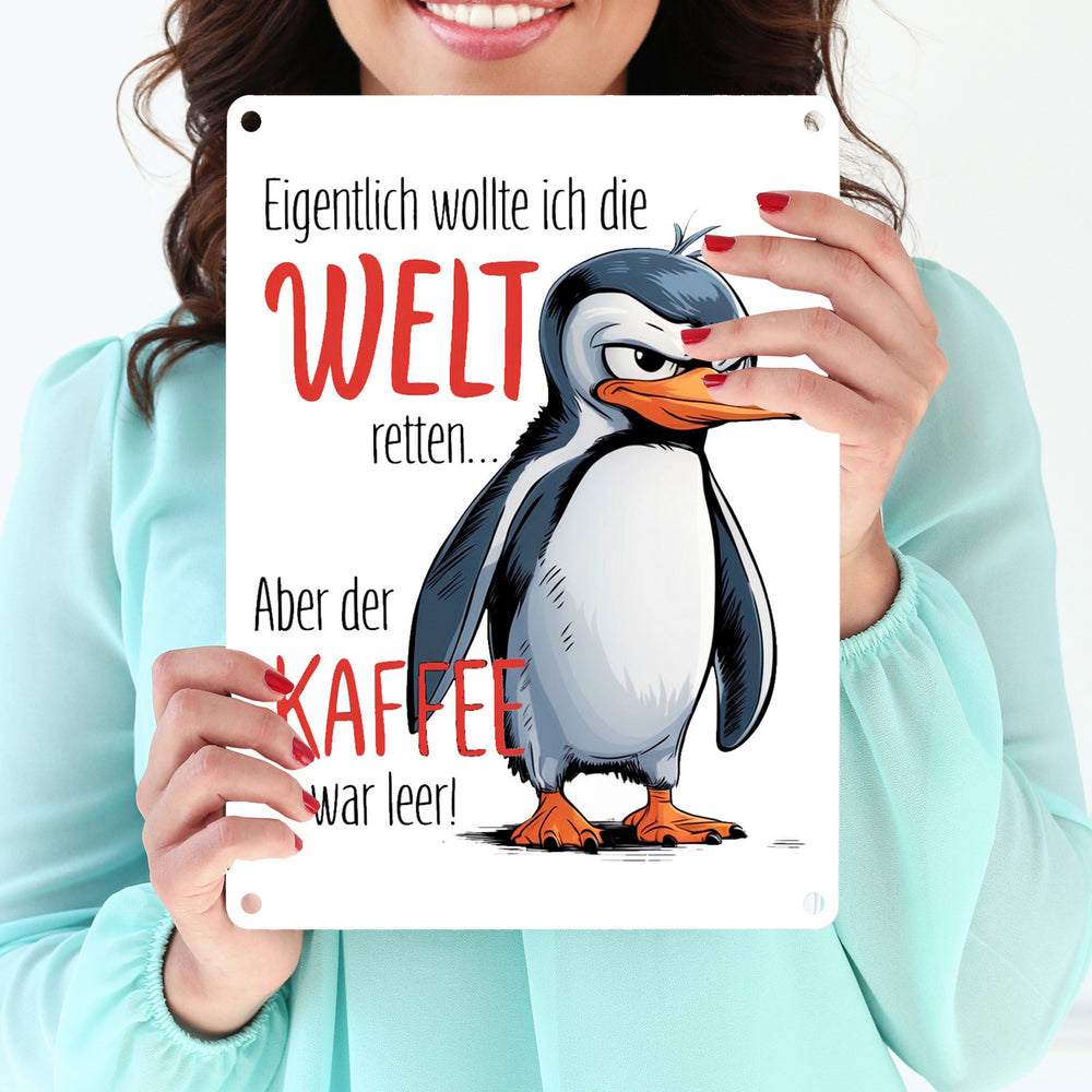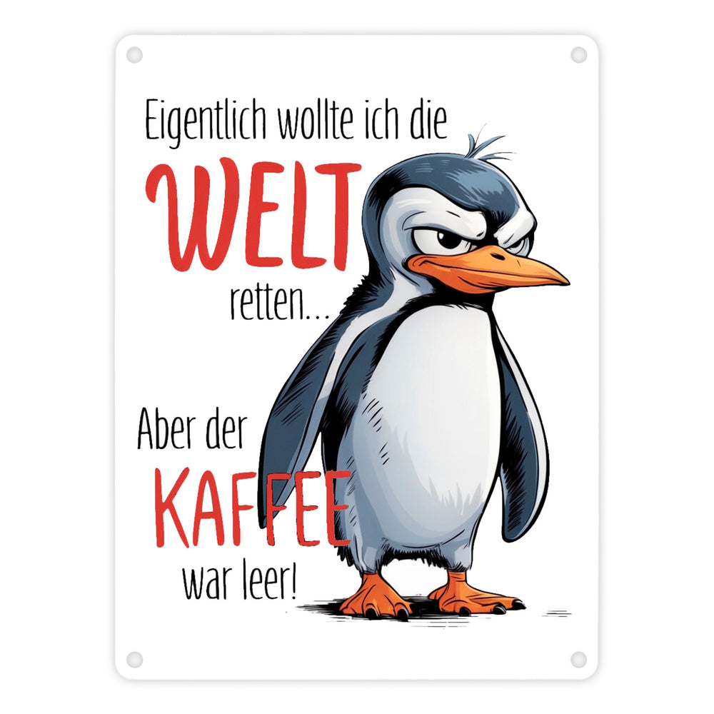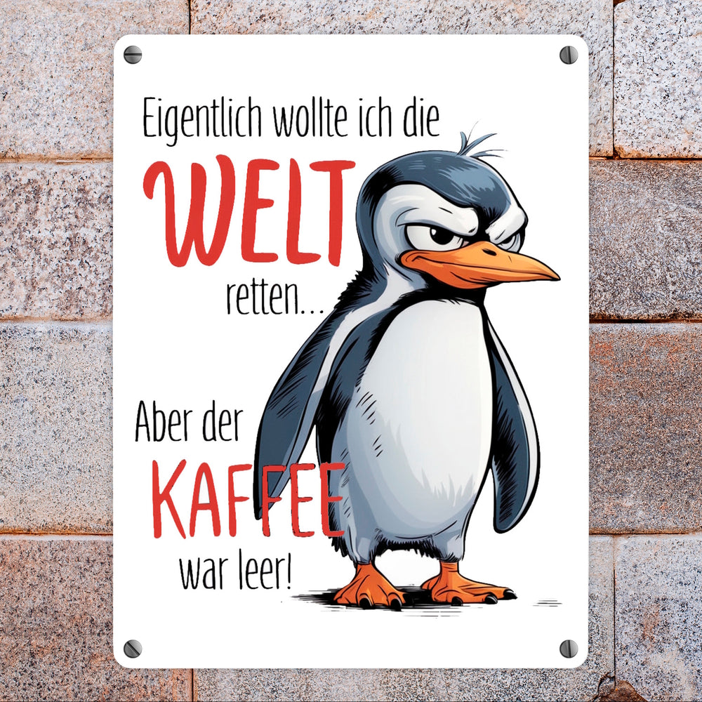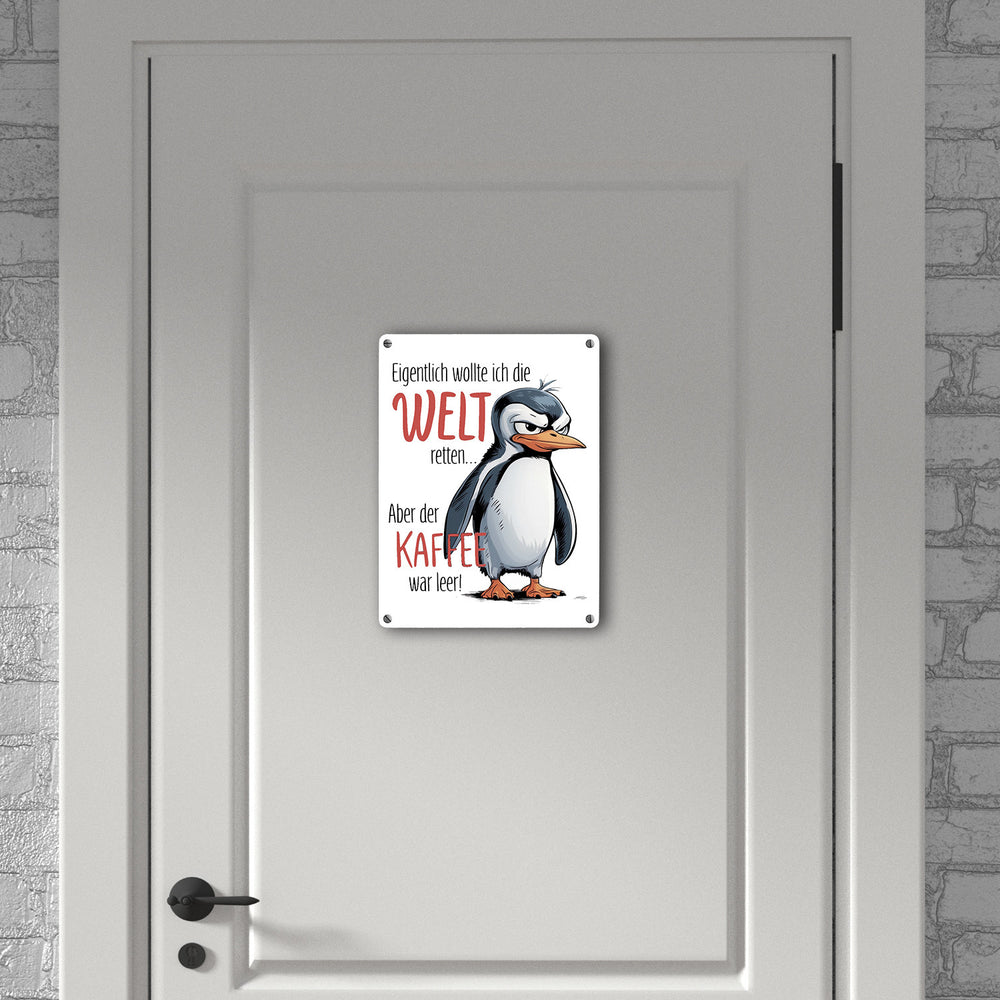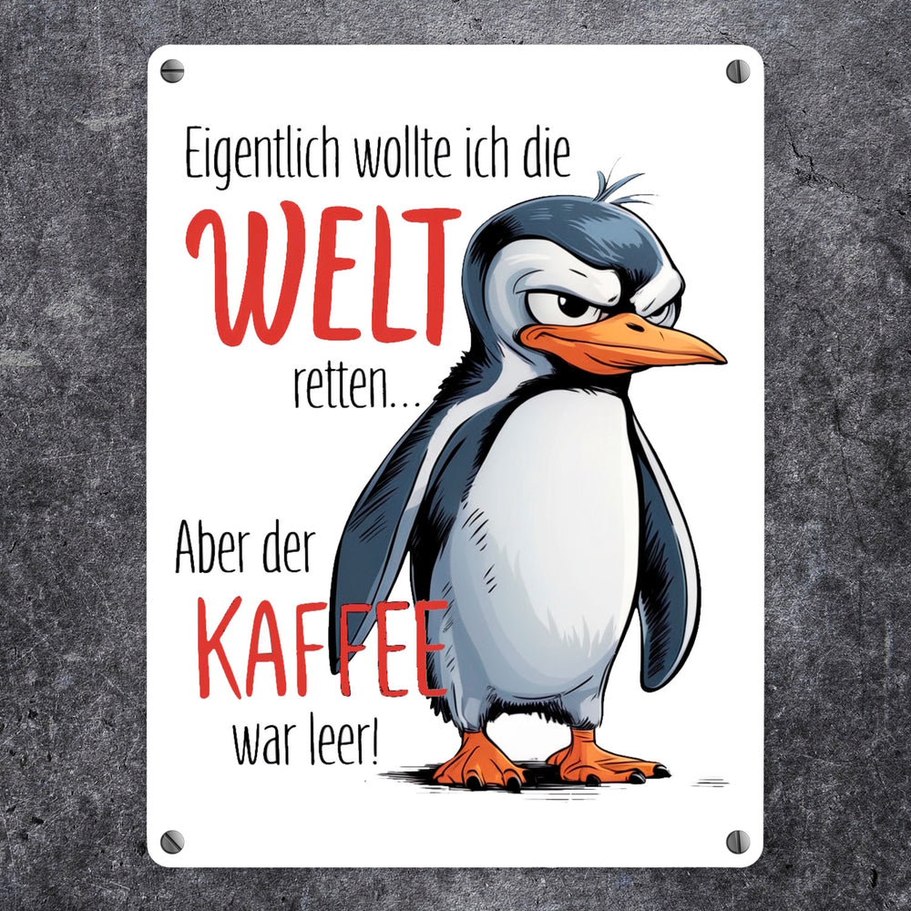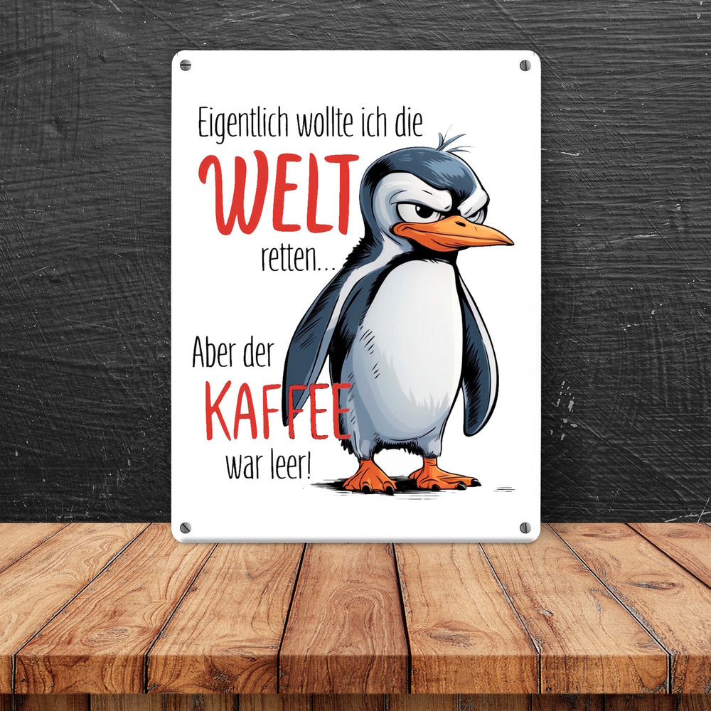 • Unser Cartoon-Pinguin-Metallschild zeigt einen charmant mürrischen Pinguin, der mit seinem schrägen Blick für Schmunzeln sorgt. Der witzige Text "Eigentlich wollte ich die WELT retten... Aber der KAFFEE war leer!" hebt sich in leuchtenden Buchstaben ab. Der weiße Hintergrund lässt den Pinguin im Mittelpunkt stehen.