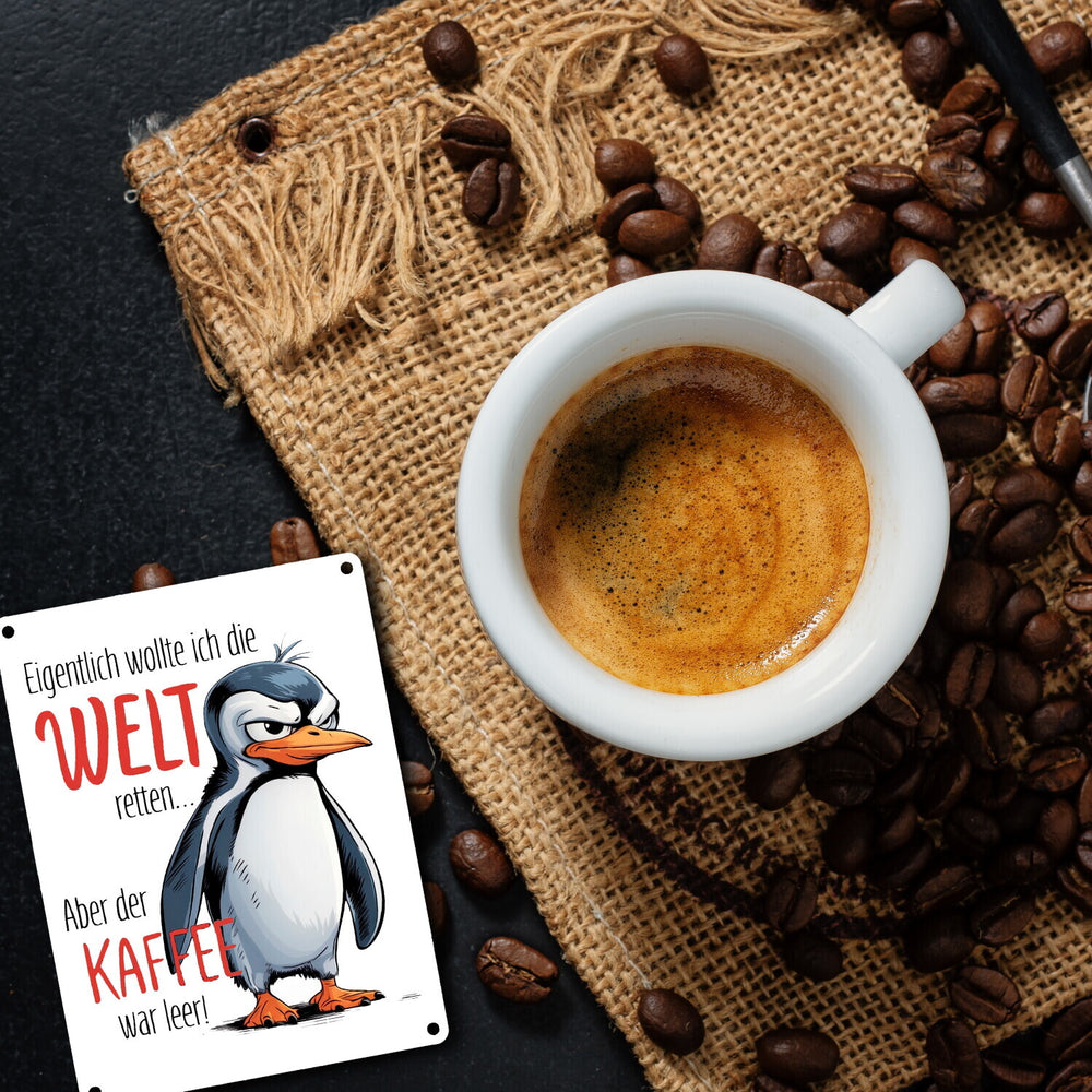 Cartoon-Pinguin Metallschild in 15x20 cm - Welt retten, Kaffee leer