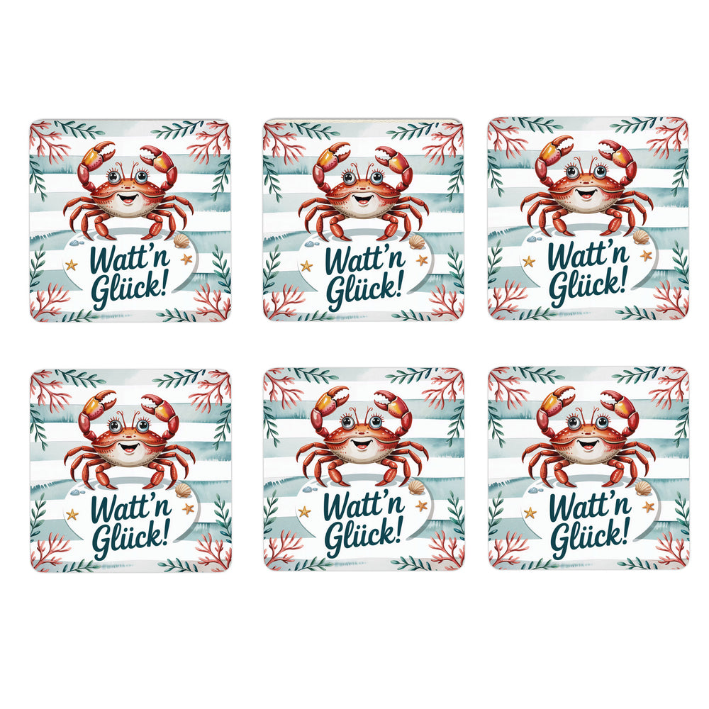 - Dieses 6er Set Untersetzer bringt die Küste direkt zu Ihnen nach Hause! Jede Unterlage zeigt eine fröhliche rote Krabbe mit Partyhut, alles kunstvoll in Aquarell gestaltet. Der Hintergrund ist sanft blau-weiß gestreift, gesäumt von zarten Korallen und Algen. Ein echter Hingucker voller maritimen Charmes!