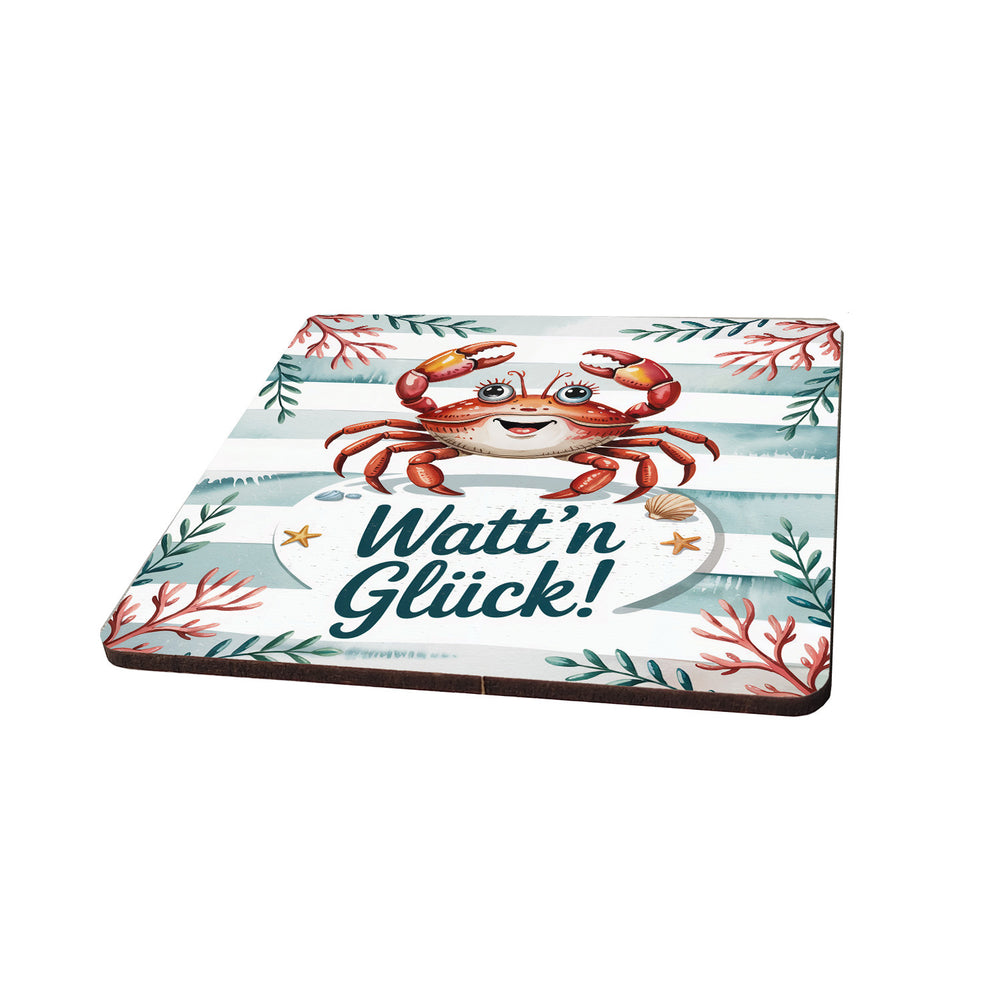 Dieses 6er Set Untersetzer bringt die Küste direkt zu Ihnen nach Hause! Jede Unterlage zeigt eine fröhliche rote Krabbe mit Partyhut, alles kunstvoll in Aquarell gestaltet. Der Hintergrund ist sanft blau-weiß gestreift, gesäumt von zarten Korallen und Alg Hinweise: Material: Holz / quadratisch / ca. 9,5 x 9,5 cm