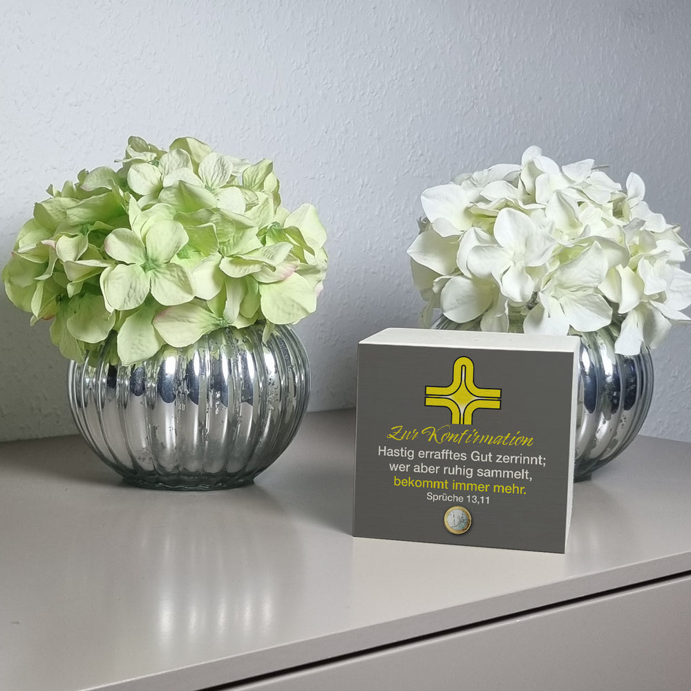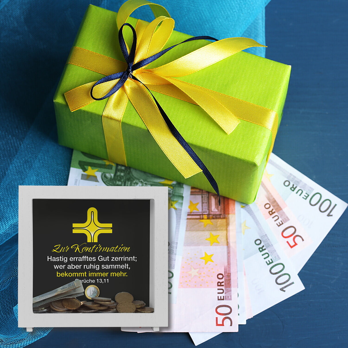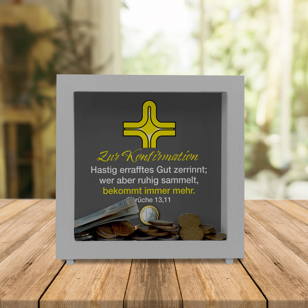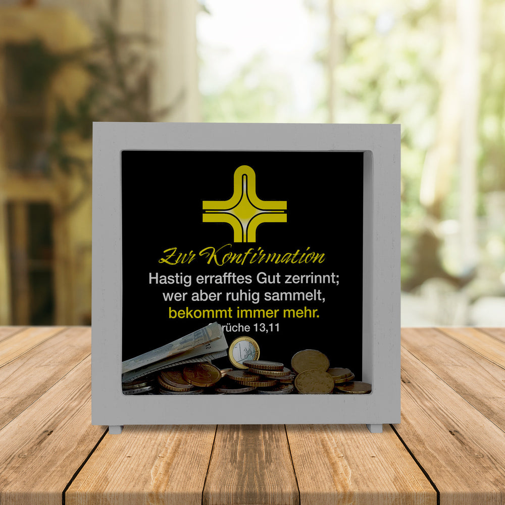 - 1x Sprüche 13,11 Bibelvers Spardose zur Konfirmation in der gewählten Ausführung