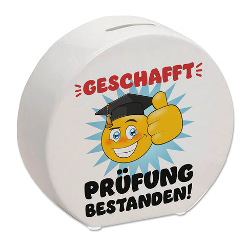 Prüfung bestanden Spardose mit Gesicht und Daumen hoch