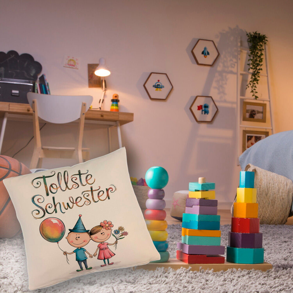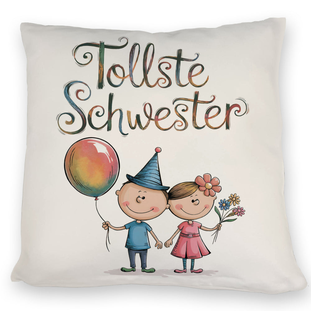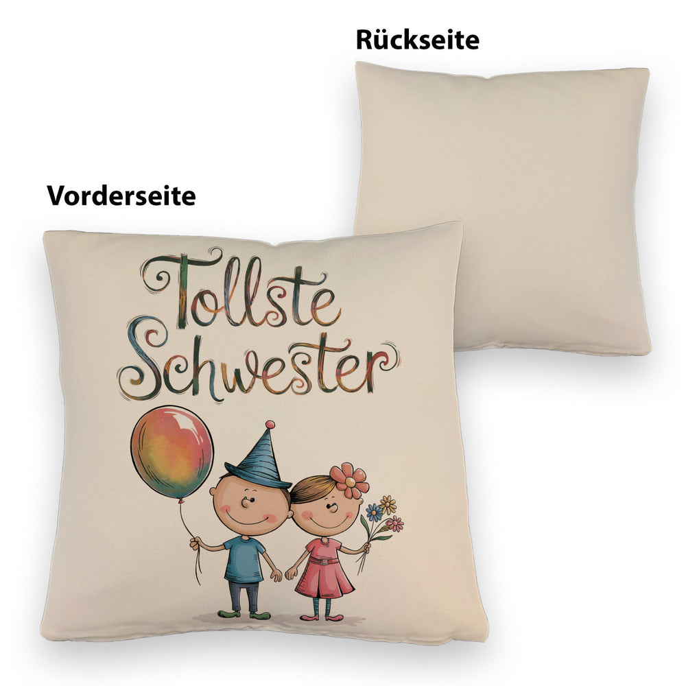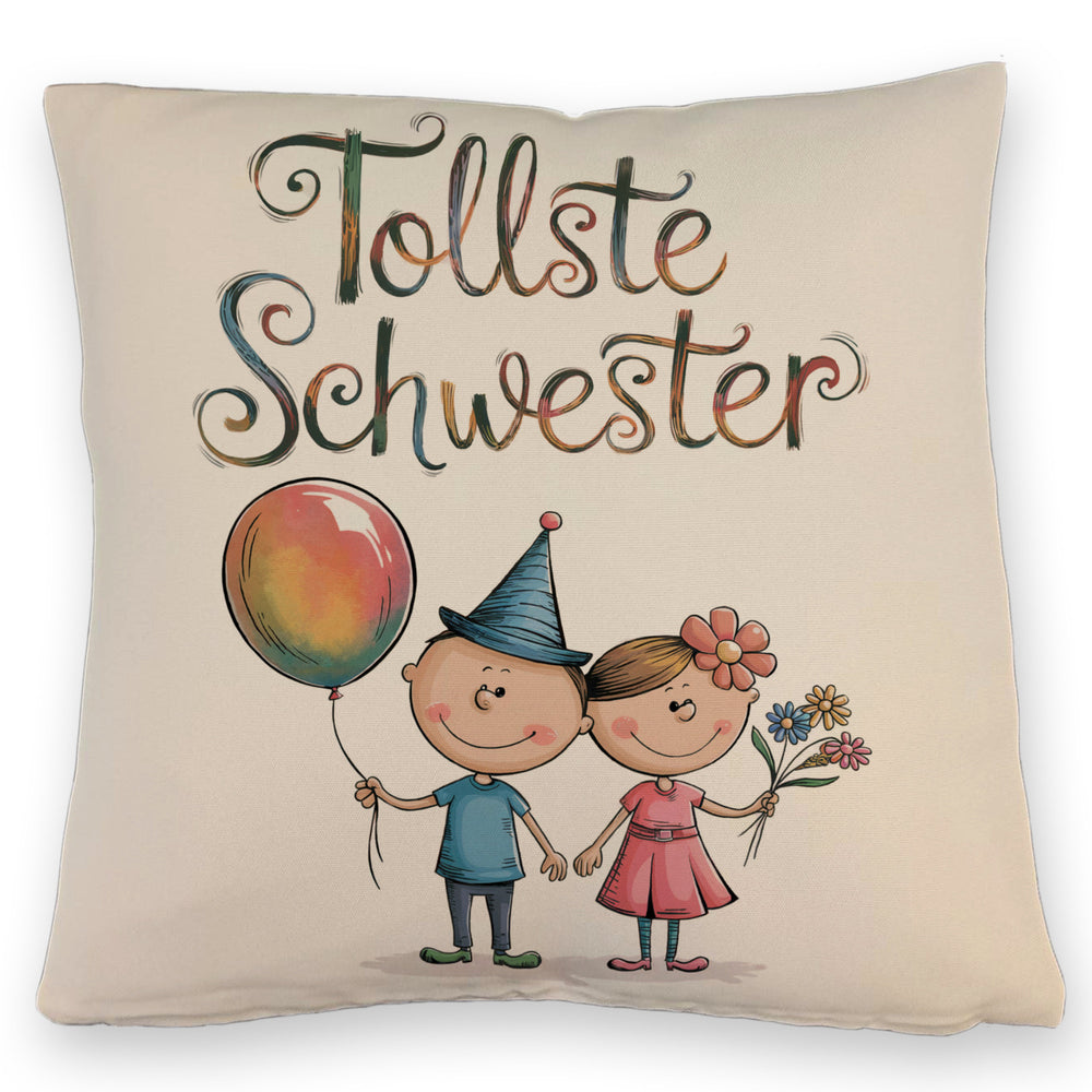 - Dieses lustige Dekokissen zeigt einen Bruder und eine Schwester als Cartoon-Figuren. Der Bruder trägt ein blaues Hemd und hält einen bunten Ballon, während die Schwester in einem rosa Kleid mit Blumenstrauß glänzt. Der Text "tollste Schwester" ziert das Kissen in verspielter Schrift. Perfekt für jedes Kinderzimmer!