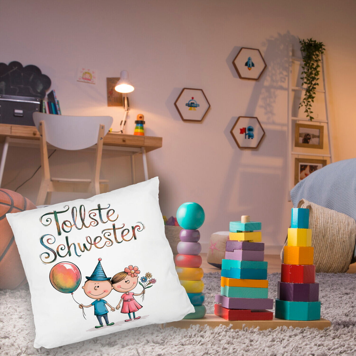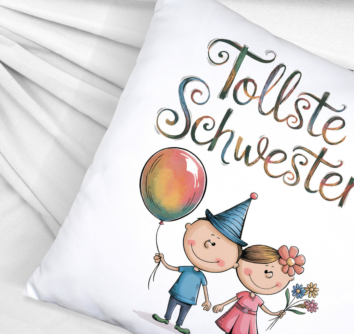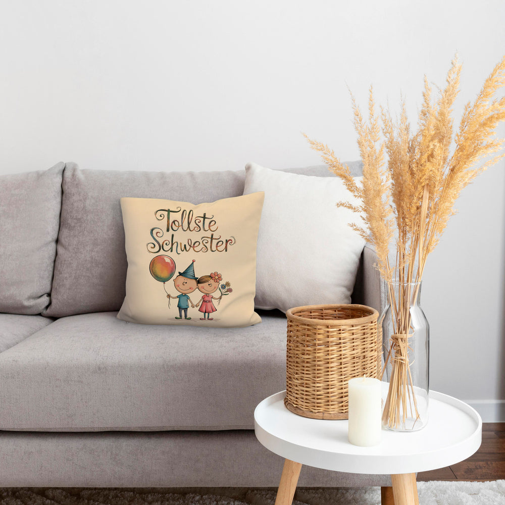 - Dieses lustige Dekokissen zeigt einen Bruder und eine Schwester als Cartoon-Figuren. Der Bruder trägt ein blaues Hemd und hält einen bunten Ballon, während die Schwester in einem rosa Kleid mit Blumenstrauß glänzt. Der Text "tollste Schwester" ziert das Kissen in verspielter Schrift. Perfekt für jedes Kinderzimmer!