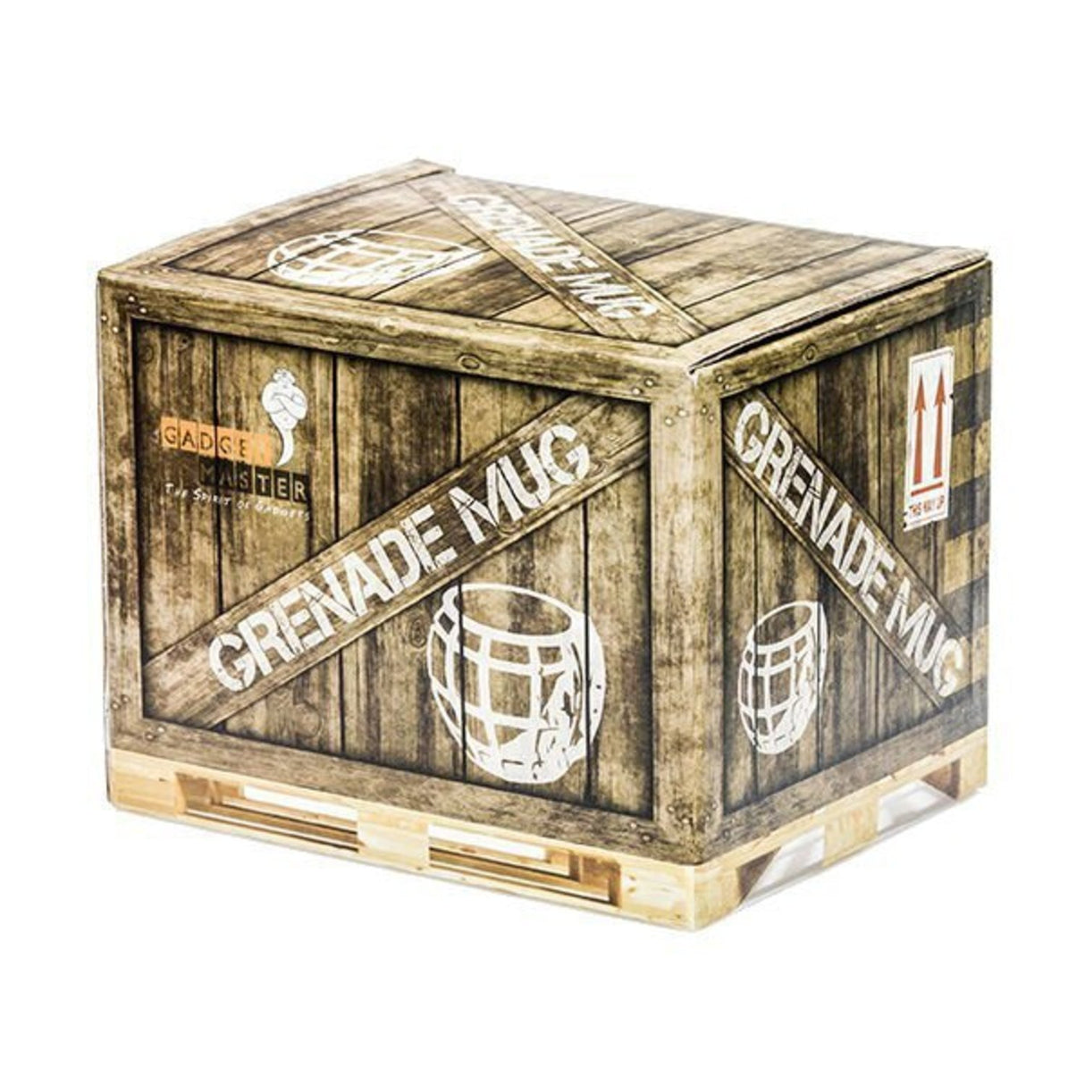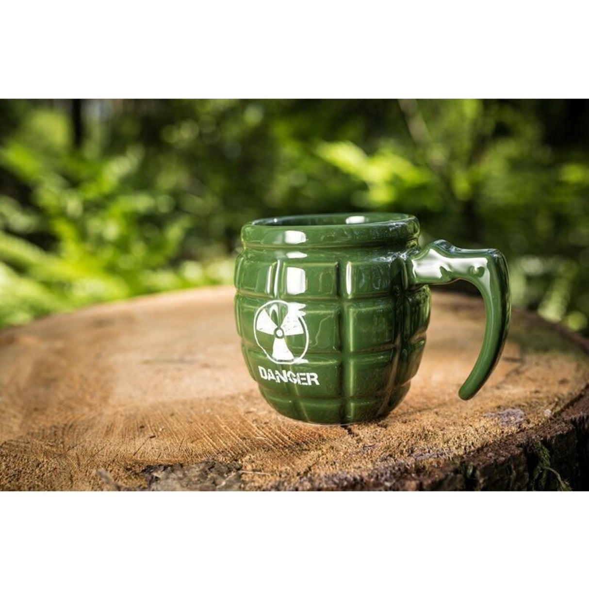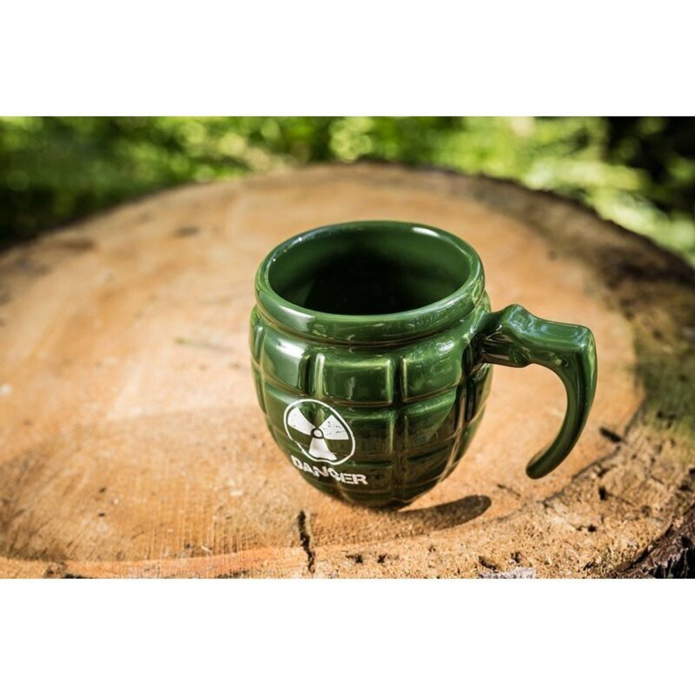 - Sogar der Griff der Tasse passt in das Gesamtbild, da er wie der Griff einer echten Granate aussieht.