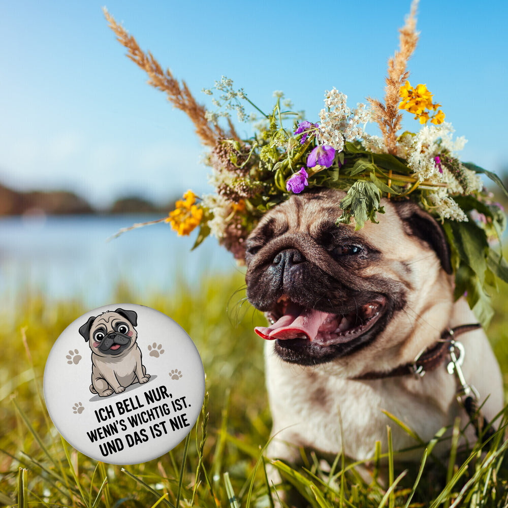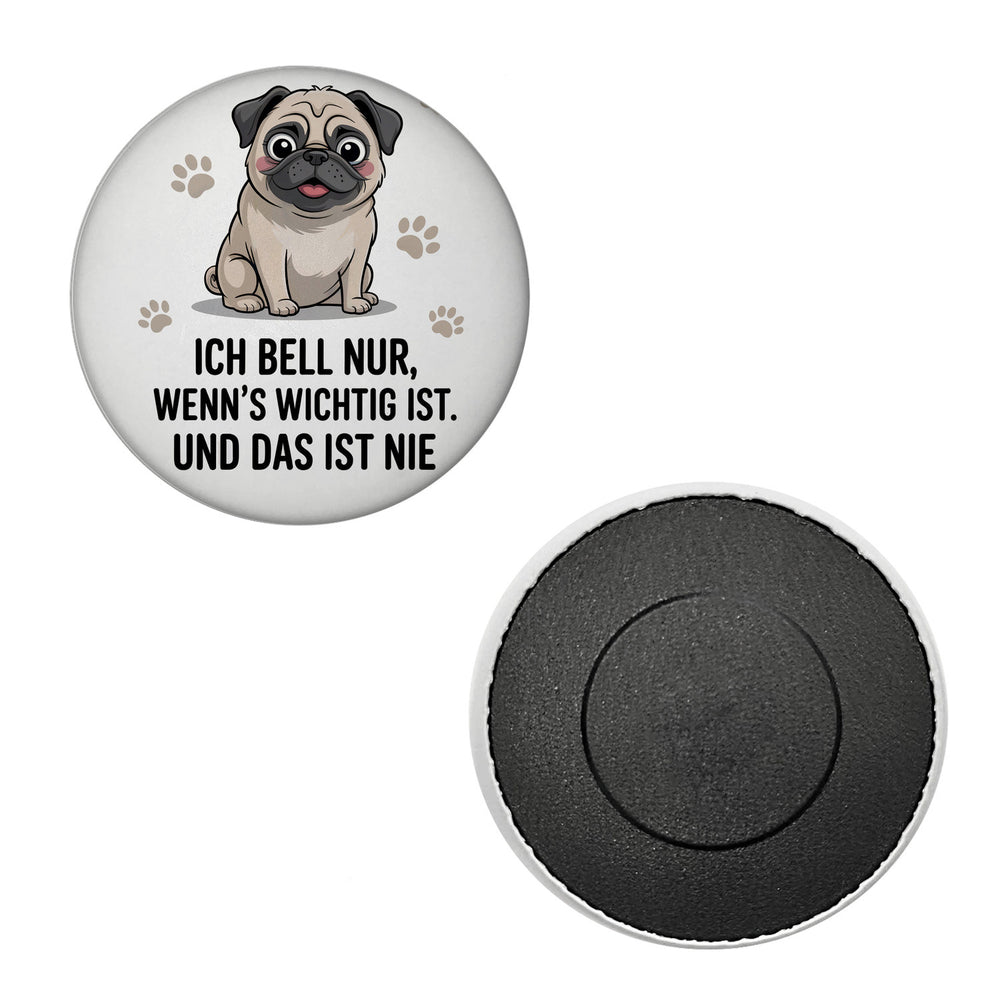 • Der runde Magnet zeigt einen charmanten Cartoon-Mops in sanften Grautönen mit großen, treuen Augen und einem verschmitzten Grinsen. Der lustige Spruch "Ich bell nur, wenn's wichtig ist. Und das ist nie" verleiht dem Magneten seinen humorvollen Charakter, während die verstreuten Pfotenabdrücke dem Design eine spielerische Note hinzufügen.