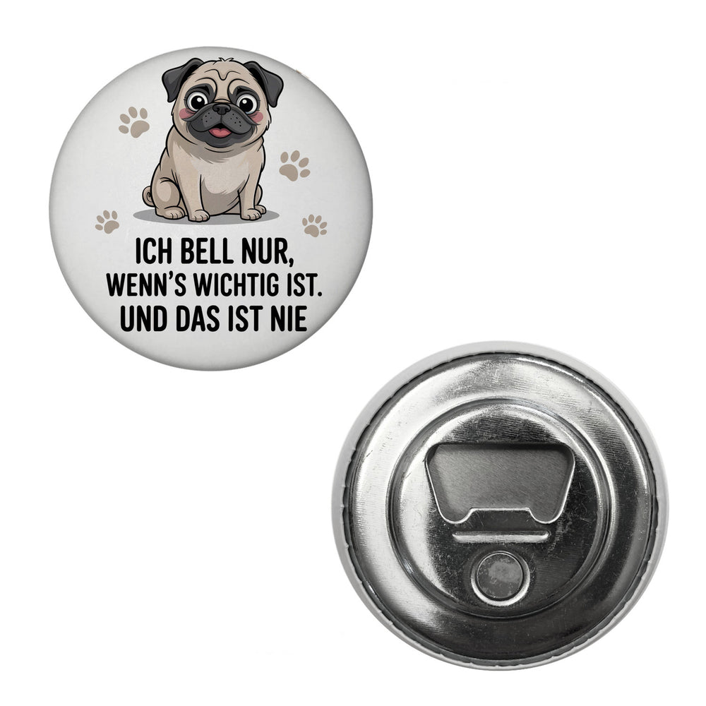 Entdecken Sie den unwiderstehlichen Ich bell nur -Mops-Magnet, der Charme und Humor in Ihren Alltag zaubert! Dieses kleine Wunderwerk künstlerischer Gestaltung zeigt einen entzückenden Cartoon-Mops mit frechem Grinsen und treuen Augen, der jedem Betrachter ein Lächeln entlocken wird. Sein frecher Spruch, Ich bell nur, wenn's wichtig ist. Und das ist nie , sorgt garantiert für heitere Stimmung – ein idealer Begleiter für all jene, die das Leben mit einer Prise Spaß genießen.Dieser Mops-Magnet, in unserer deutschen Manufaktur mit Liebe zum Detail gefertigt, kommt in zwei praktischen Ausführungen: als klassischer Magnet oder mit integriertem Flaschenöffner. Perfekt für Kühlschrank, Büro oder jegliche metallische Oberfläche, hält er Ihre Notizen sicher fest und bringt gleichzeitig eine Ladung Lebensfreude in Ihren Raum.Ein ideales Geschenk für Mops-Fans und Hundeliebhaber, bringt dieser Magnet ein Glitzern in die Augen und ein Lächeln auf die Lippen Ihrer Liebsten. Machen Sie Geburtstage, Feiertage oder einfach den Alltag zu einem besonderen Erlebnis mit dieser humorvollen Kleinigkeit, die zudem ganz groß im Herzen wirkt. Schenken Sie Freude und lassen Sie den Mops für Sie sprechen – lautlos, aber höchst wirkungsvoll!