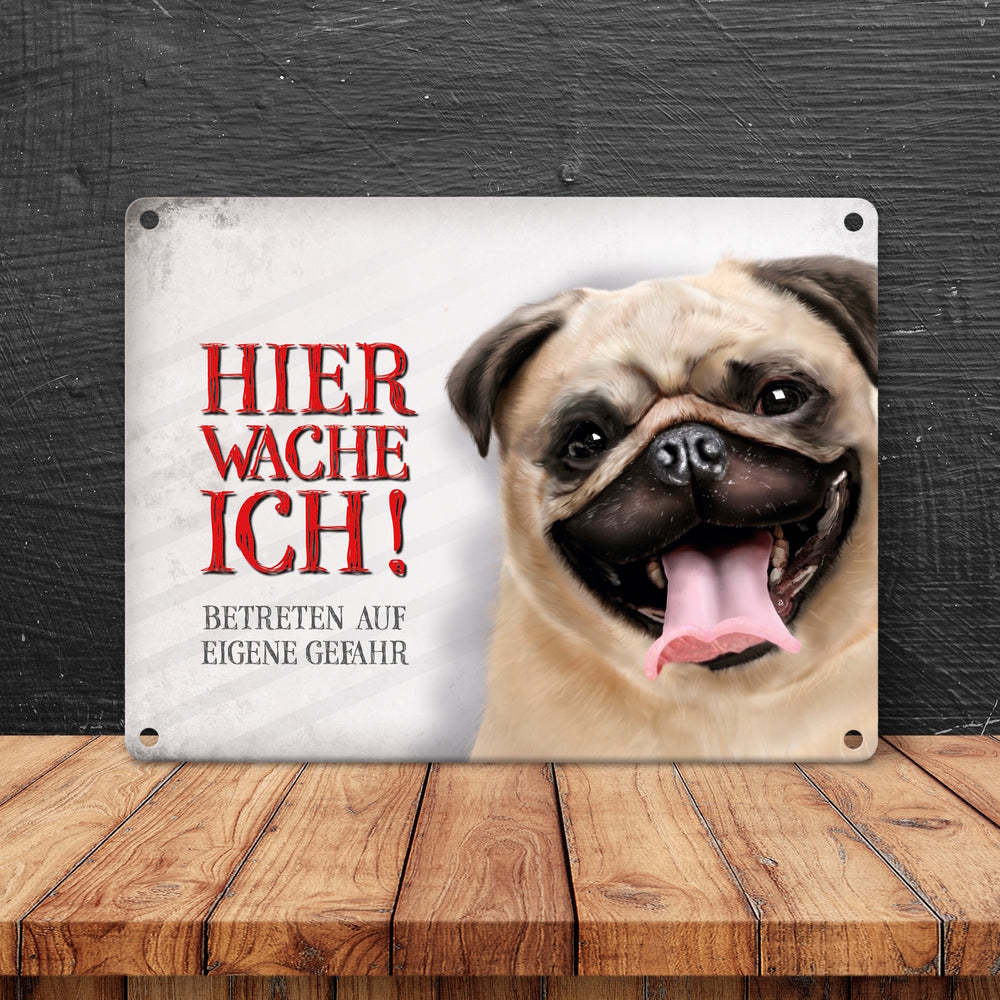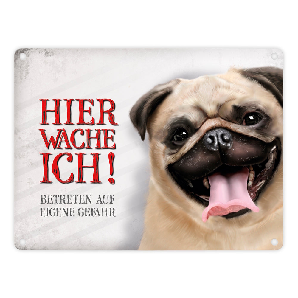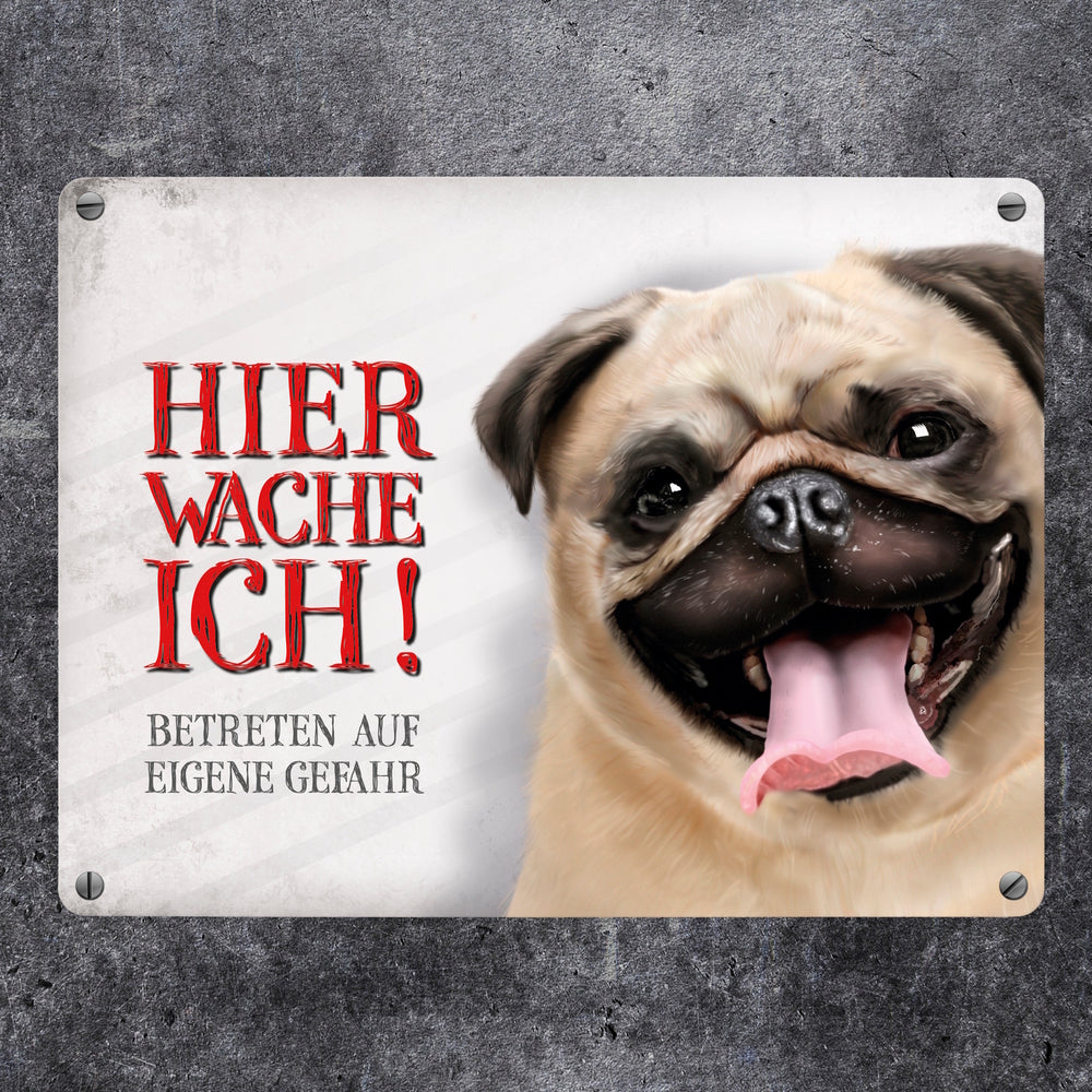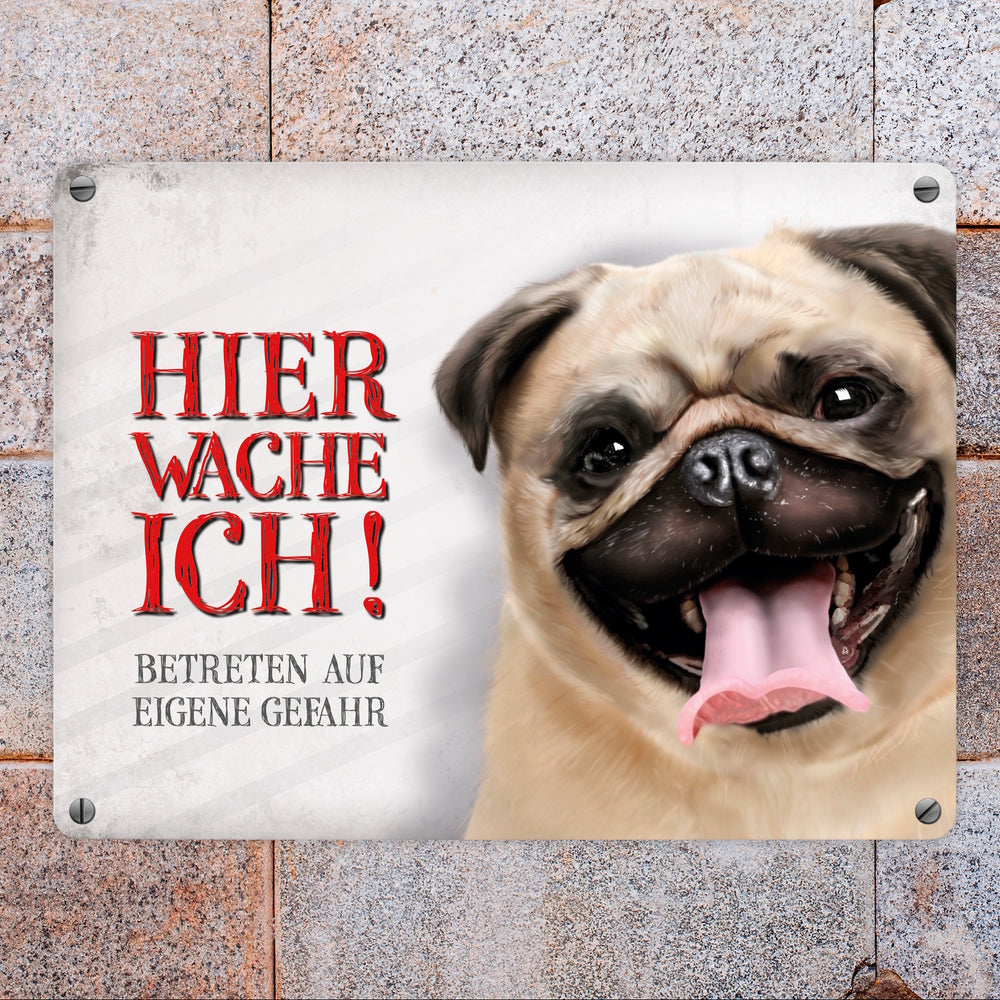 Metallschild mit Mops Motiv und Spruch: Betreten auf eigene Gefahr ...
