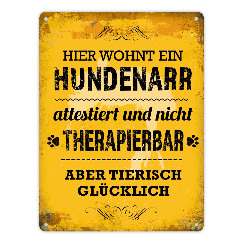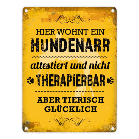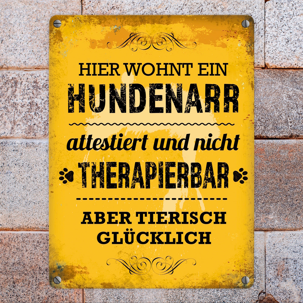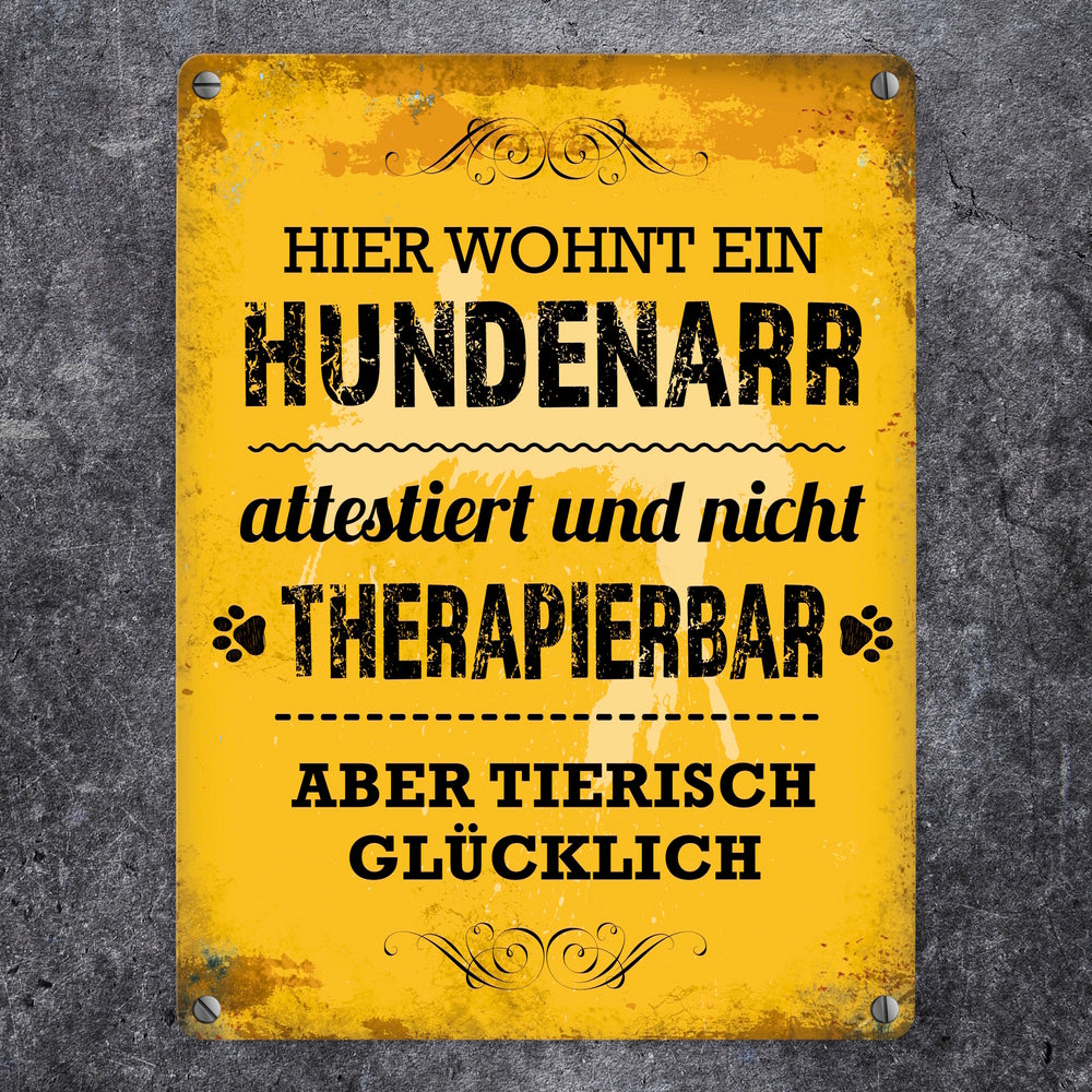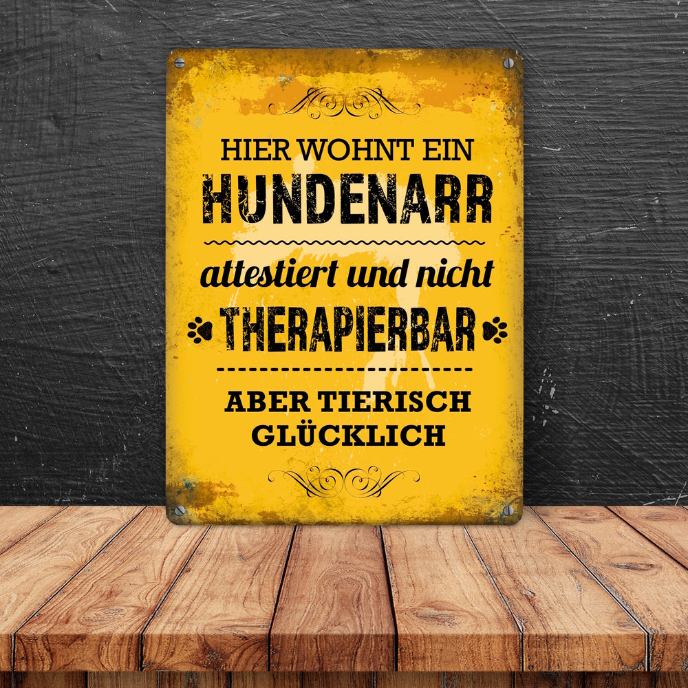 • 1x Metallschild mit Spruch: Hier wohnt ein Hundenarr - nicht therapierbar aber tierisch glücklich in der gewählten Größe