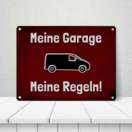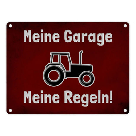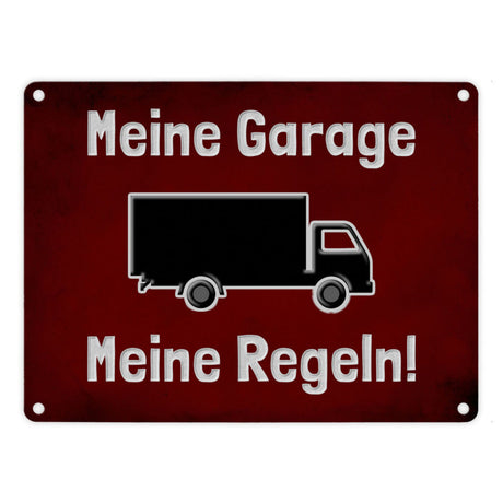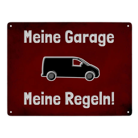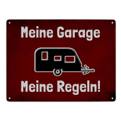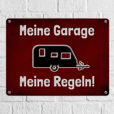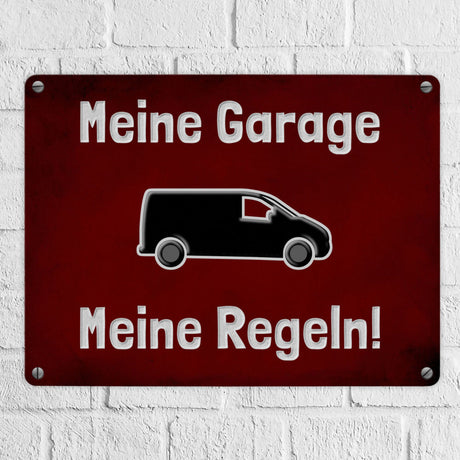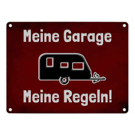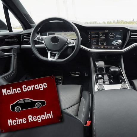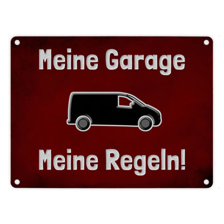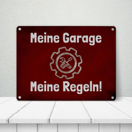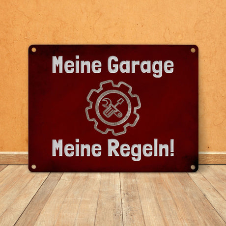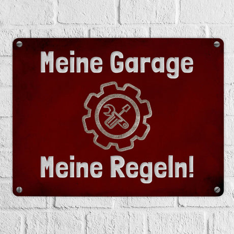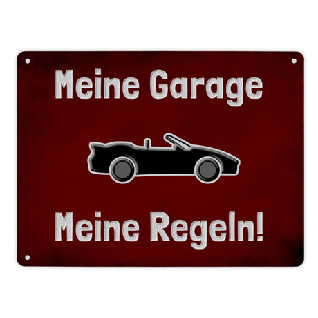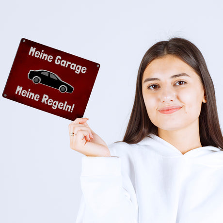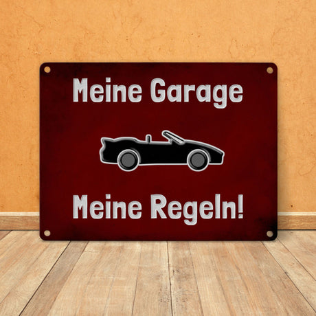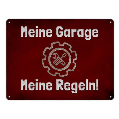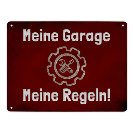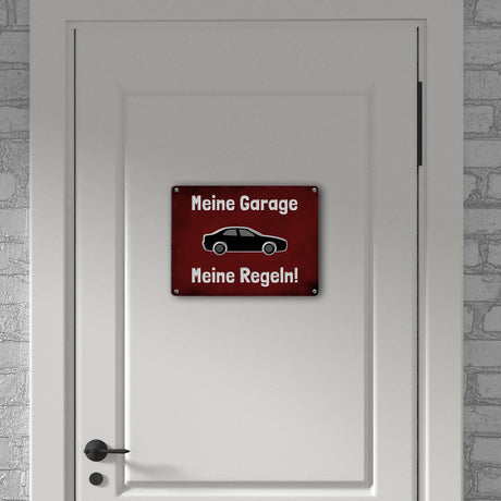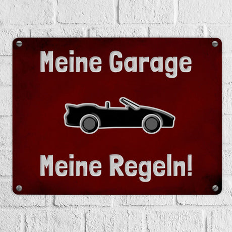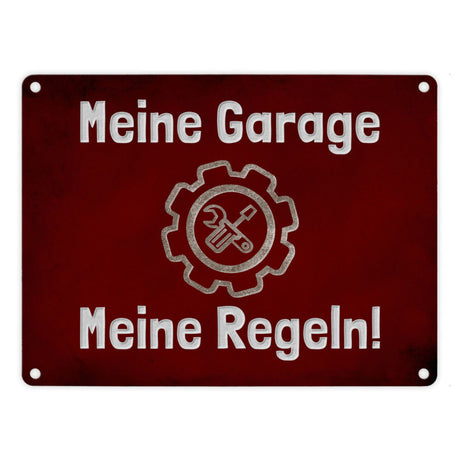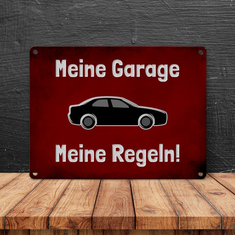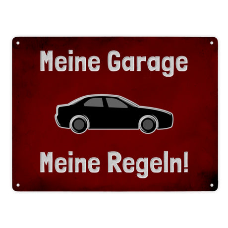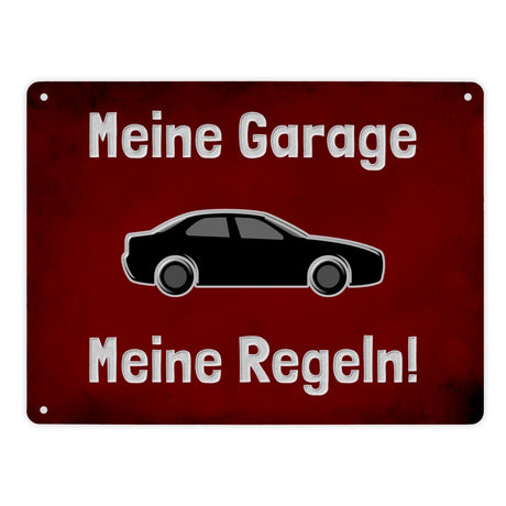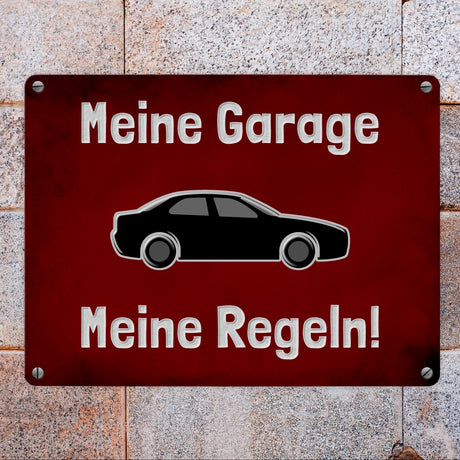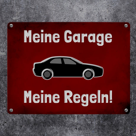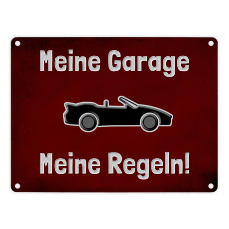 Meine Garage Meine Regeln! Metallschild in 15x20 cm mit Auto und rotem Hintergrund