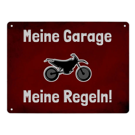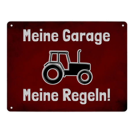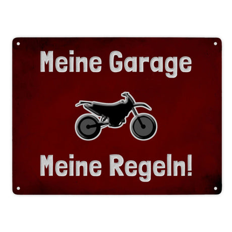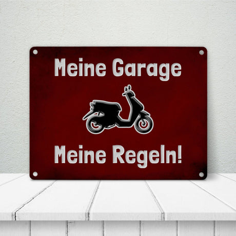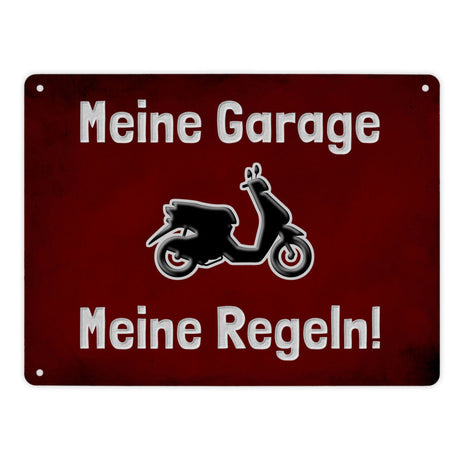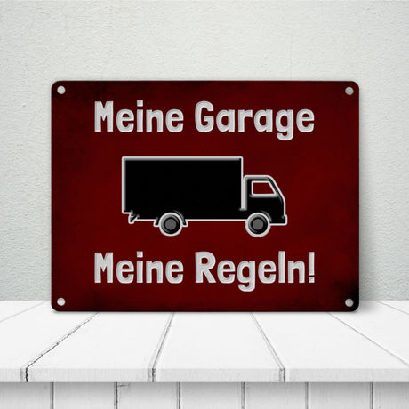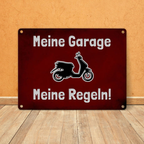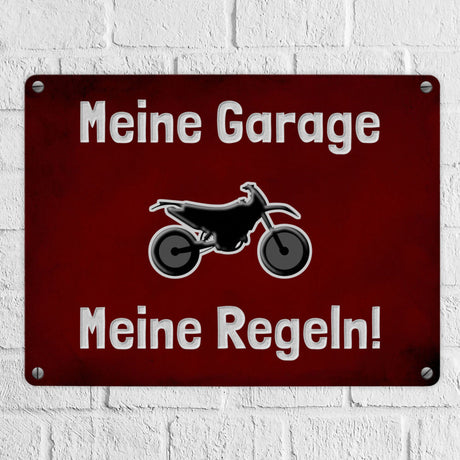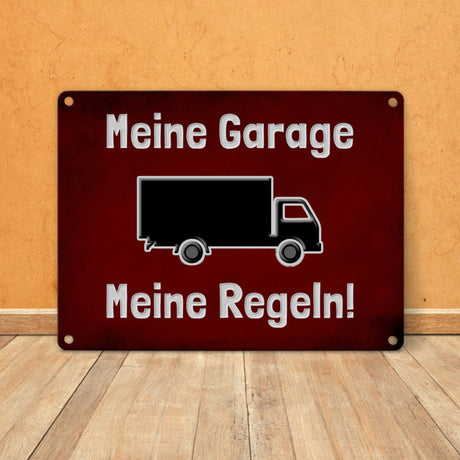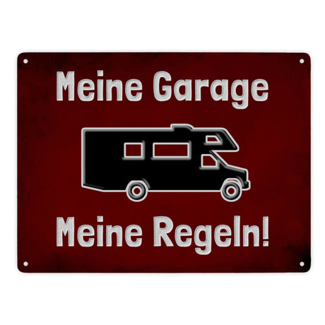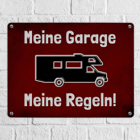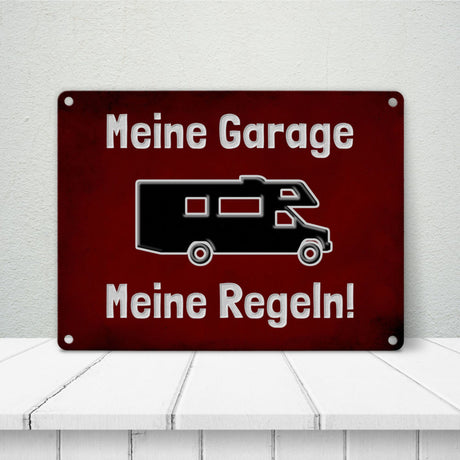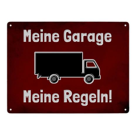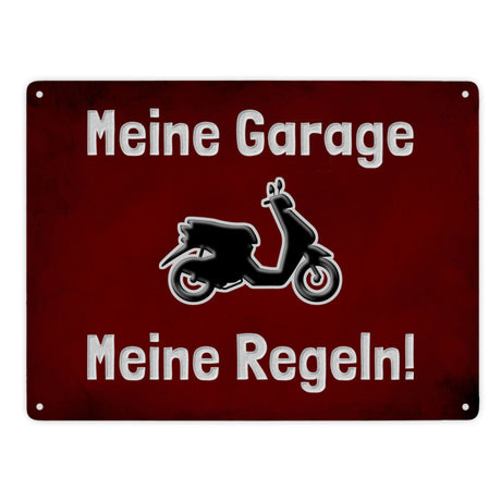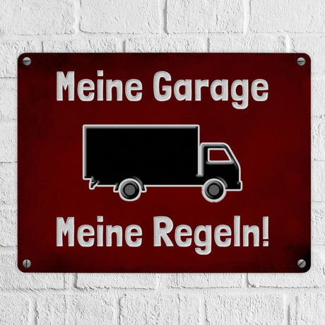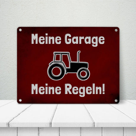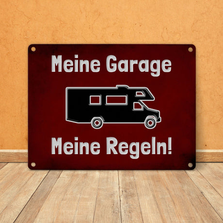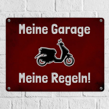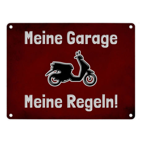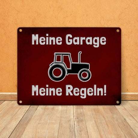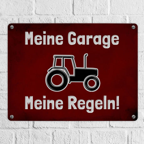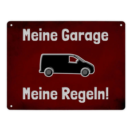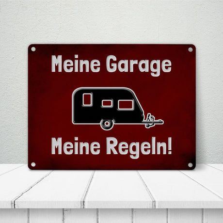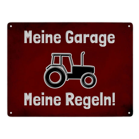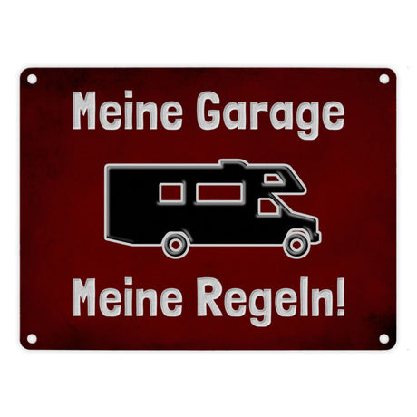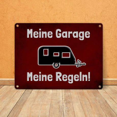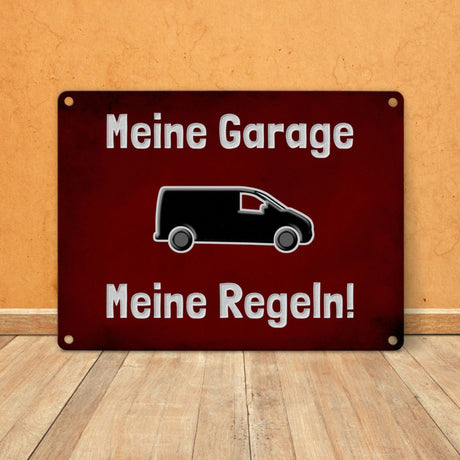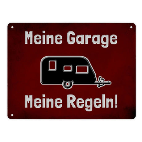 Meine Garage Meine Regeln! Metallschild in 15x20 cm mit Auto und rotem Hintergrund